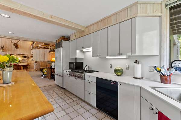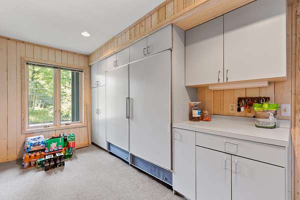 The kitchen has a large island/bar and features commercial grade appliances. Two dining tables and a built in desk compliment this area of the great room. The laundry room w/utility tub, washer & dryer, built in commercial fridge & freezer, ice machine and storage closets.
