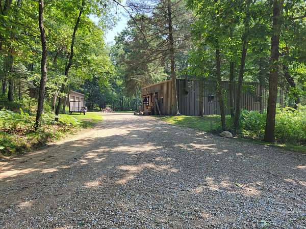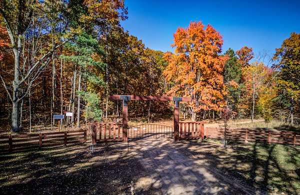The impressive massive timber entrance is Amish crafted from red oak trees taken off the property. The solar powered custom lighted gate compliments the mile-long driveway to the lodge. The private drive in is spectacular!