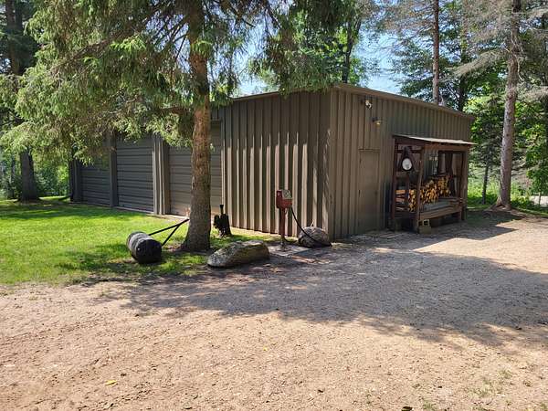 A 48? x 32? steel framed garage with 3 bays, a wood stove and workshop area.