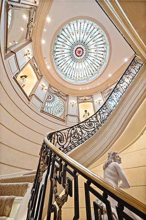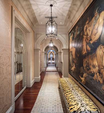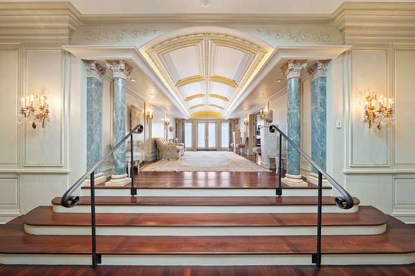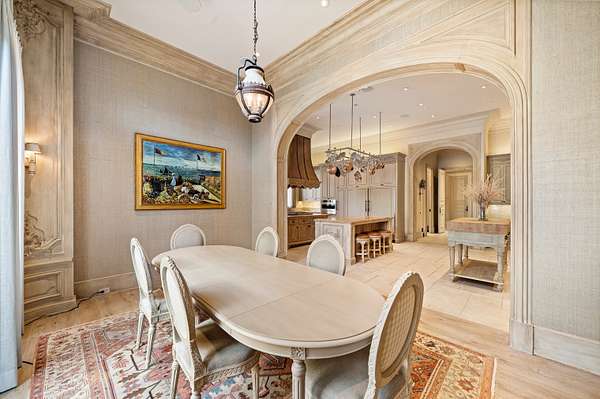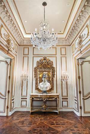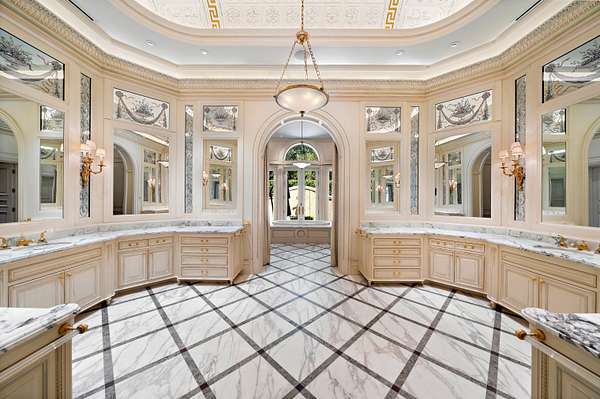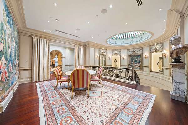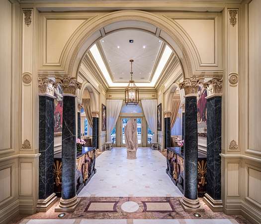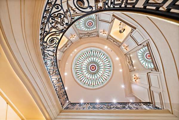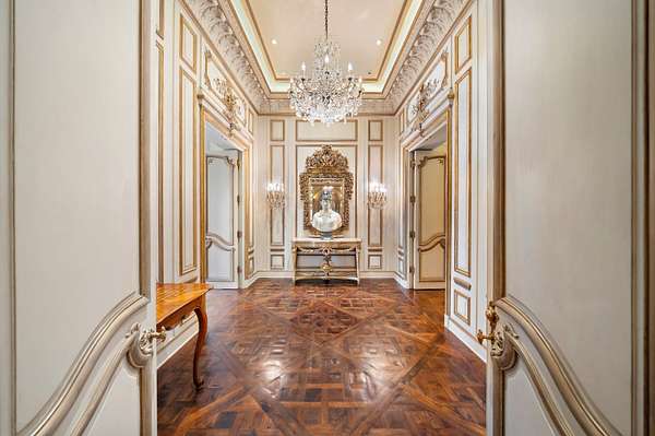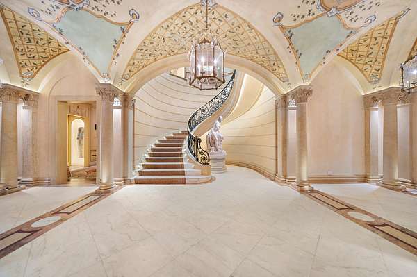 Inspired by the regal splendor of Versailles, Venice, and the Alhambra, this estate radiates European aristocratic majesty. Marble and parquet floors, soaring 14-foot ceilings, and intricate stained-glass accents elevate its beauty. A grand staircase crowned by a stunning stained-glass dome leads to the estate's heart: a magnificent central cupola supported by marble columns. Every detail, from hand-carved wall panels and elaborate crown moldings to gilded medallions and opulent finishes, speaks to a legacy of refinement. A monumental entrance and vaulted main hallway set the tone for the estate's remarkable interiors, including a dazzling grand salon, an elegant formal dining room, and double kitchens complete with a breakfast nook and a secluded outdoor walled garden.