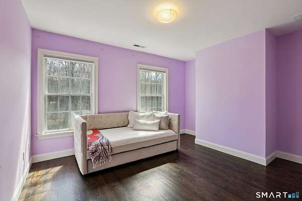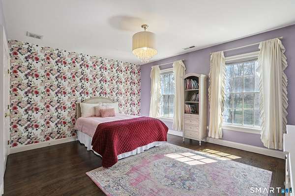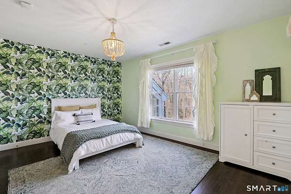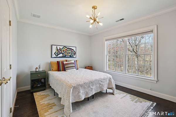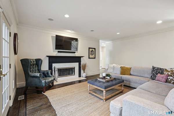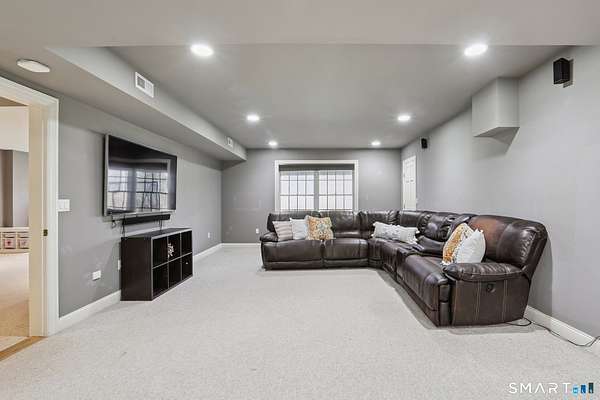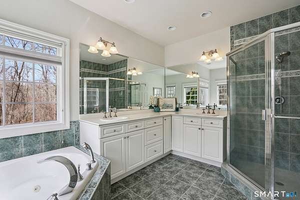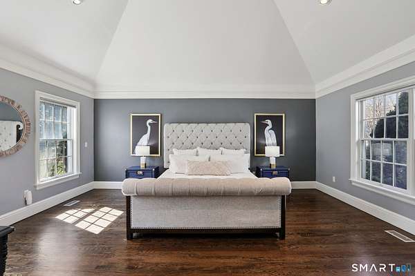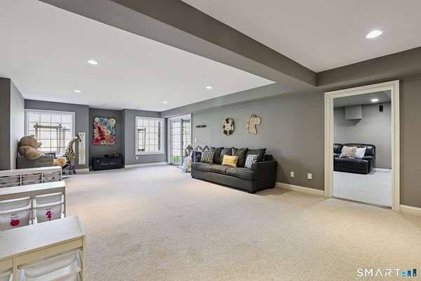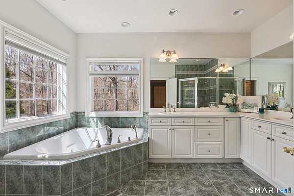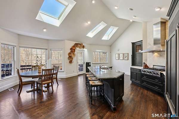 A dramatic two-story entry sets the tone, drawing your eye to the sun-drenched great room, where soaring ceilings and walls of glass frame ever-changing light. The eat-in kitchen with vaulted ceiling and skylights feels bright and inviting, complimented by premium appliances including a six-burner Viking cooktop, double ovens, Sub-Zero refrigerator, and Bosch dishwasher. A marble backsplash, expansive center island, and wet bar with beverage refrigerator complete the space. Designed for both everyday living and effortless entertaining, the kitchen flows into the family room with a striking double-sided fireplace, as well as the formal dining room. The main level primary features a vaulted ceiling, dual walk-in closets, and ensuite bath. The office offers a refined work-from-home setting, complete with custom built-ins and a marble fireplace. Upstairs, four bedrooms and two full baths are thoughtfully arranged into two suite-style layouts, offering flexibility for family, guests, or additional workspace. The finished walk-out lower level expands the home's versatility, featuring a large rec space and a separate area currently used as a media room, also ideal for an in-law or au pair suite with its own full bath. Outdoors, a full-length deck spans the rear of the home, accessible from both the kitchen and family room, creating seamless indoor-outdoor living. Located minutes from top-rated schools, golf, dining, shopping, and commuting routes.