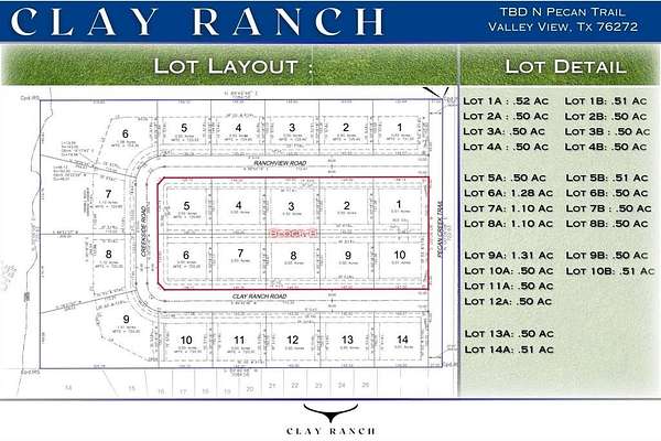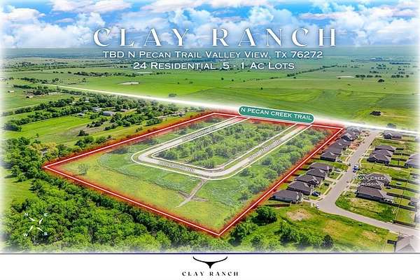 Discover Clay Ranch, a brand-new community in Valley View, TX. This exclusive subdivision offers spacious half-acre and acre lots with city water, private septic, high-speed internet, and co-op power. Designed for both convenience and quality, the neighborhood will feature concrete roads and minimal HOA restrictions, with annual dues of just $100.