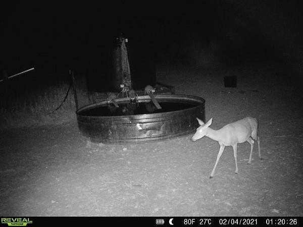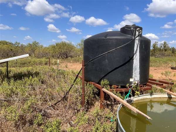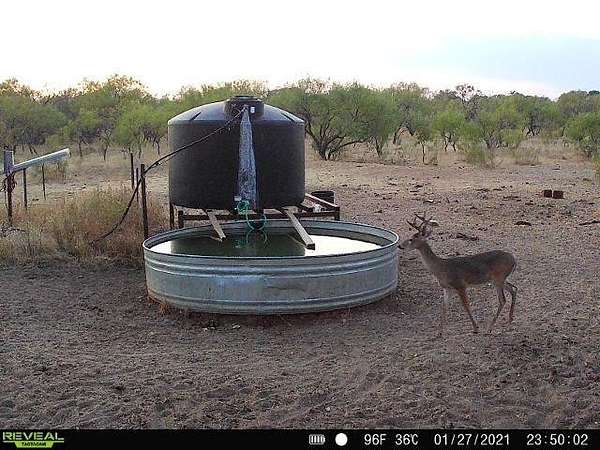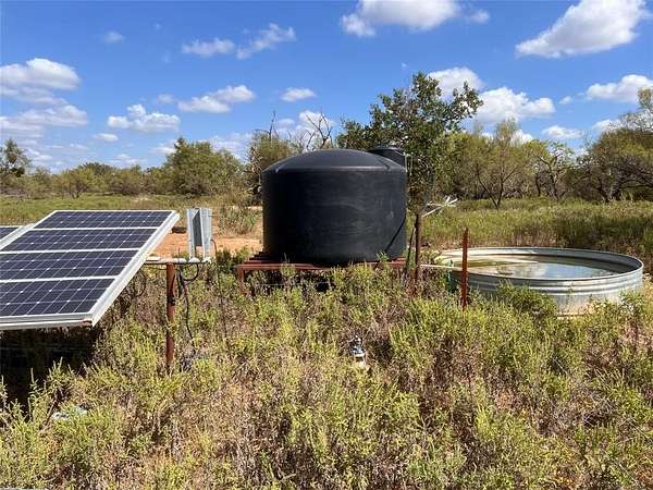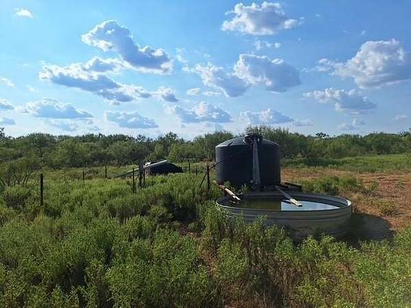 A solar powered water well with 30 GPM, a depth of 235 feet, a storage tank and a large water trough