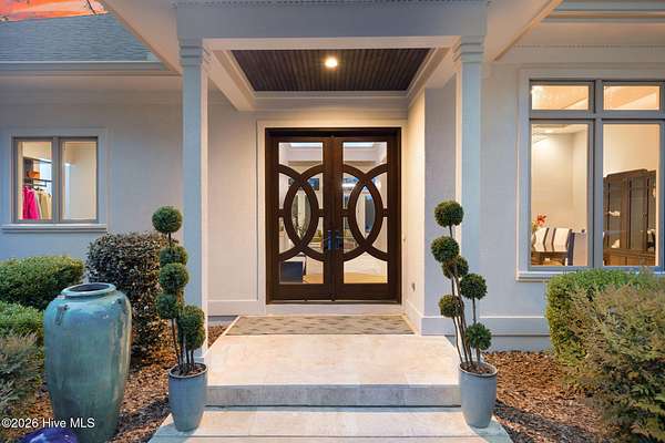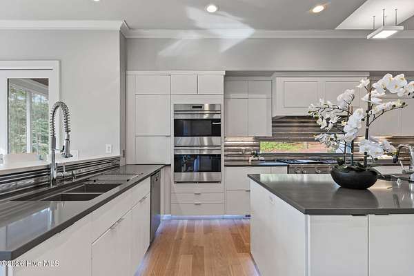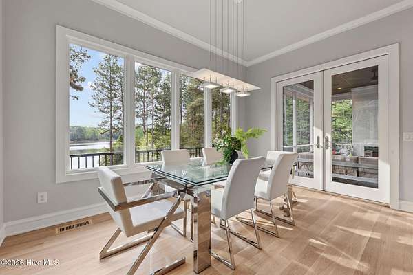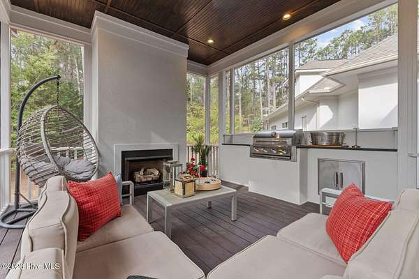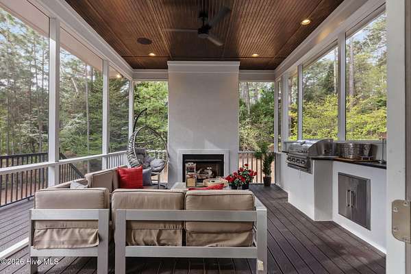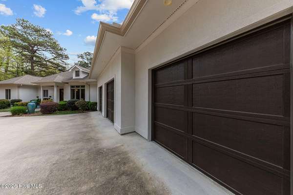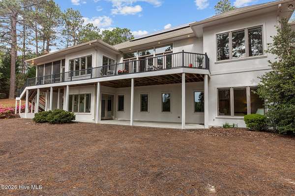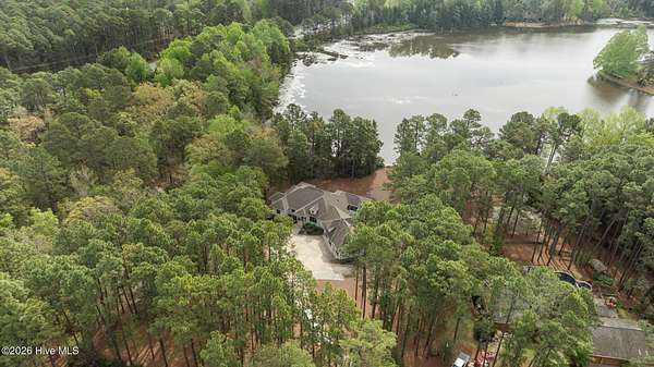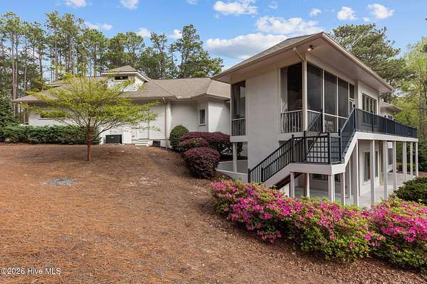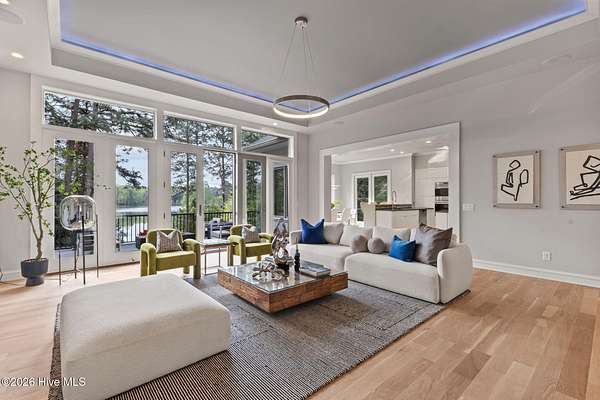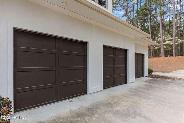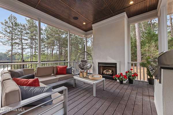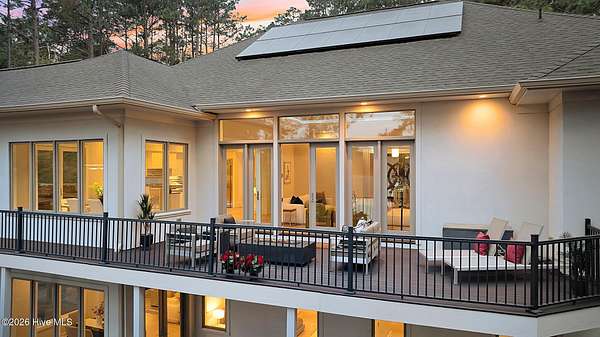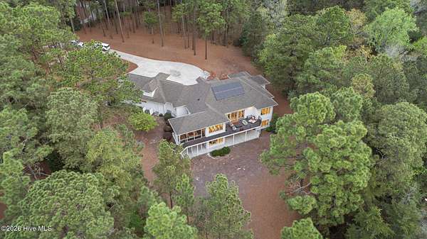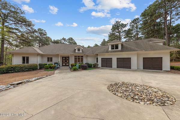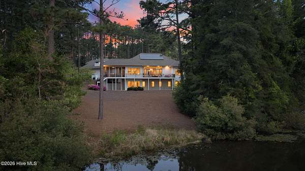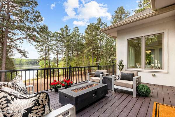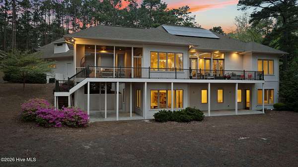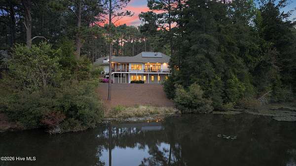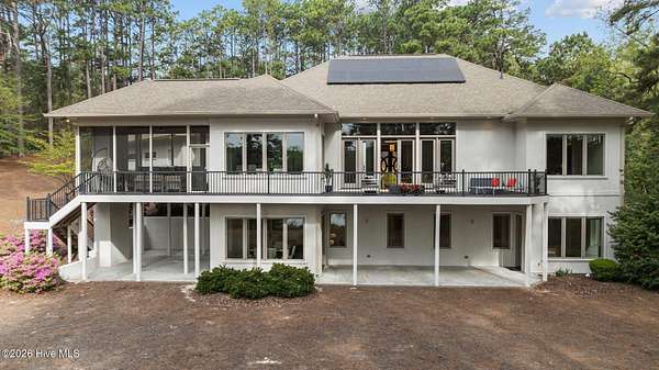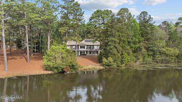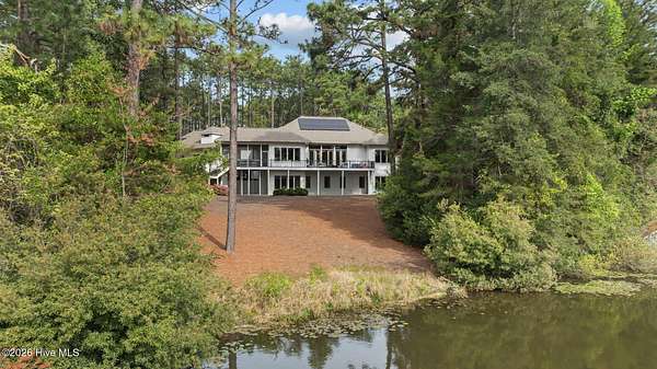 Inspired by the clean, modern lines of South Beach and custom built by Lee Huckabee in 2015, this striking waterfront residence was featured in the 2015 Parade of Homes and represents a rare offering within the gated Country Club of North Carolina. Perfectly positioned on 1.9 acres along Inverness Lake, the property delivers a refined balance of architectural sophistication, privacy, and effortless indoor-outdoor living. Thoughtfully designed for both everyday efficiency and elevated entertaining, the home offers 5,590 heated square feet across two levels, with a main-level primary suite and expansive lower level featuring three additional bedrooms, a dedicated fitness space, and secondary living areas. At the heart of the home, the chef's kitchen is equipped with a Wolf 8-burner gas cooktop, double convection ovens, dual Bosch dishwashers, quartz countertops, and a discreet built-in coffee station. Seamlessly connected living spaces are enhanced by integrated Sonos surround sound throughout the home, porches, and garage, while curated designer lighting and custom millwork create a polished, contemporary aesthetic. The primary suite is designed as a true private retreat, featuring a sound-insulated bedroom, wet bar, dual custom closets, and a spa-inspired wet room with multiple showerheads, soaking tub, and Hansgrohe fixtures. Outdoor living is elevated with over two levels of thoughtfully designed space, including a screened porch with built-in grill and fireplace--ideal for year-round entertaining overlooking the water. Built with both performance and peace of mind in mind, the home includes geothermal heating and cooling, owned solar panels, and a steel-reinforced safe room. Additional features include a three-car garage with over 1,100 square feet, unfinished flex spaces for future expansion, and meticulously planned storage throughout. A distinctive modern retreat in one of Pinehurst's most prestigious communities, this property offers a rare combination of design, technology, and lifestyle.