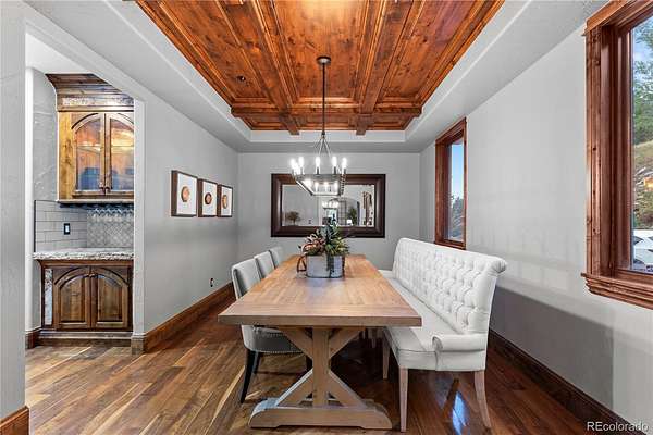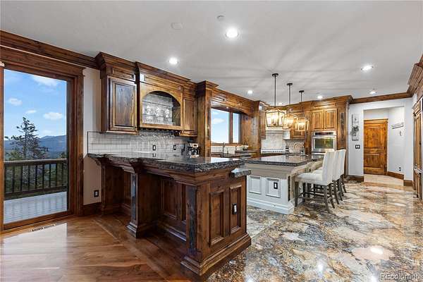 Tucked into a peaceful corner of Evergreen, this inviting custom retreat greets you with a charming porte-cochère, offering a warm welcome and sheltered entry. Inside, soaring ceilings, rich wood beams, and striking onyx slab flooring create a sense of comfort and character, while expansive windows frame breathtaking views of the Continental Divide.