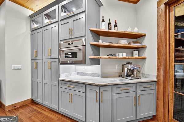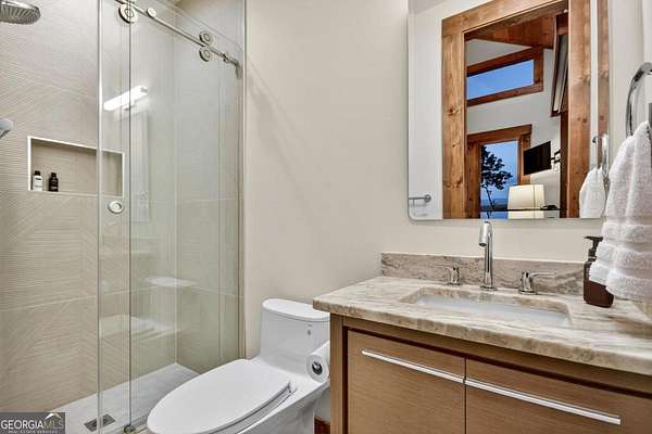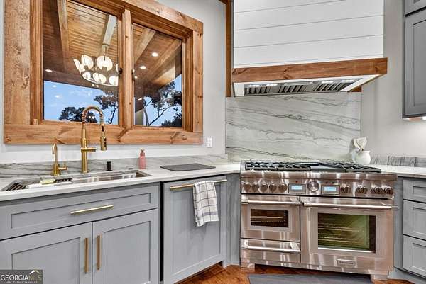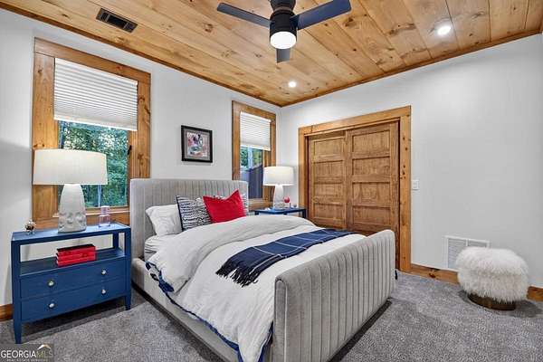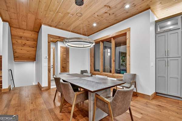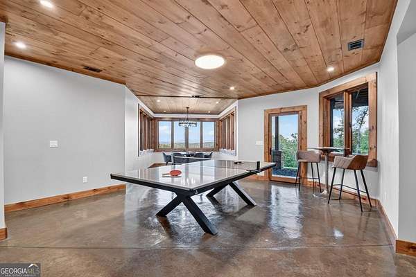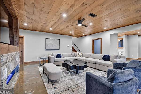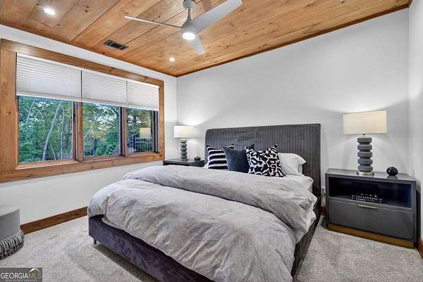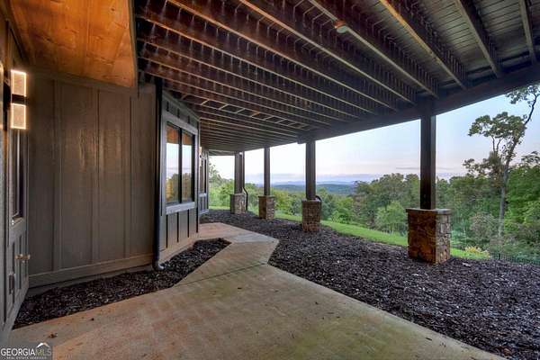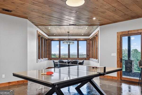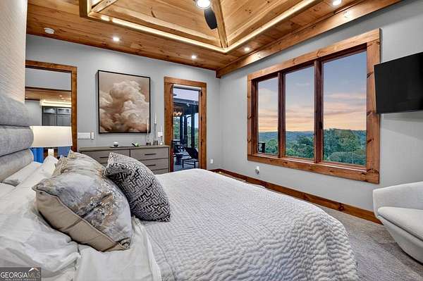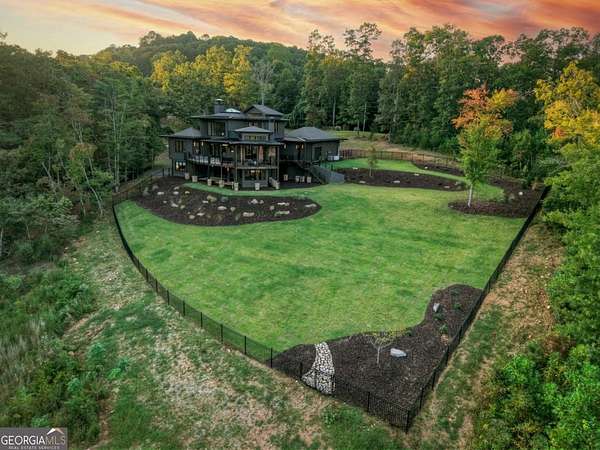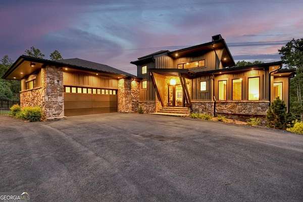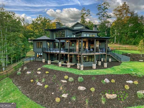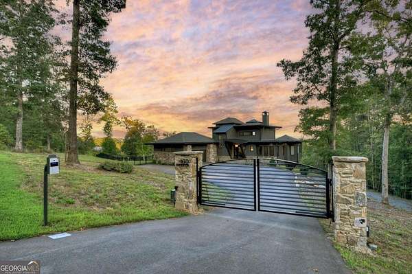 Welcome to a stunning blend of modern craftsmanship and Asian-inspired architecture nestled in the quiet mountains of North Georgia. This nearly new, four-bedroom, four-and-a-half-bath home offers over 5,600 square feet of thoughtfully designed living space on more than four private, lushly landscaped acres. With panoramic, layered mountain views from nearly every room, this home brings nature's beauty indoors through expansive sliding panel doors and floor-to-ceiling stone fireplaces. The design honors elegance and simplicity with pagoda-style rooflines, rich wood detailing, and a seamless indoor-outdoor layout. Natural light flows freely thanks to a striking 10-foot glass skylight atop a standing seam metal roof. Inside, cozy meets contemporary with imported tile, heated floors, and high-end finishes throughout. The spacious primary bedroom includes a tranquil, spa-inspired bath, while two chef's kitchens and a separate guest suites provide comfort and functionality for family and visitors alike! Outdoor living is at its finest with porches and patios on every level-perfect for morning coffee with mountain air or evening gatherings under the stars. Whether you're relaxing in the game room, enjoying the home office, or organizing within the generous storage areas, there's room for work and play. The gated drive leads to a three-car garage, and the fenced yard offers privacy and peace. Located just minutes from historic downtown Blue Ridge and adventures on the Toccoa River, this home combines serenity, style, and convenience. It's more than a house-it's a retreat crafted for life's best moments.