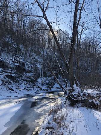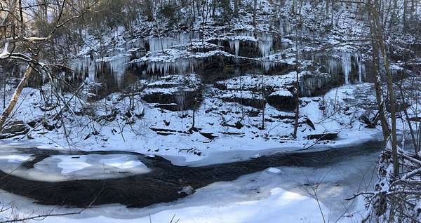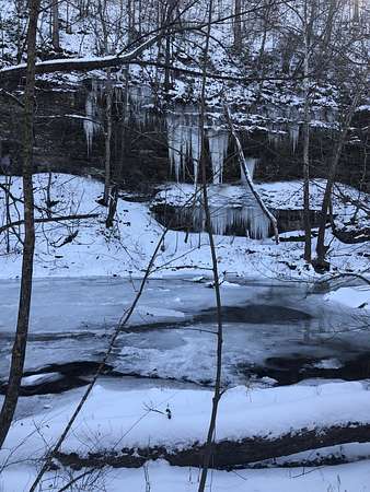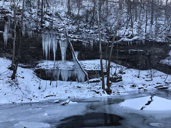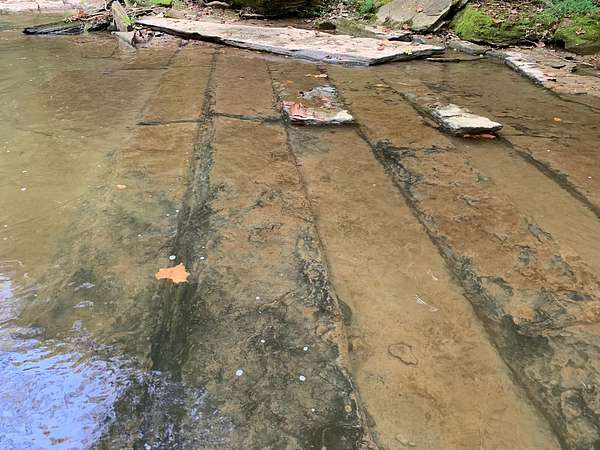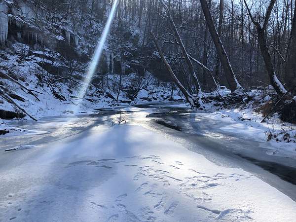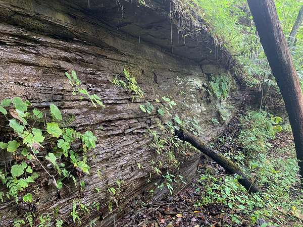 A 100-foot rock cliff rises above the creek, forming a dramatic natural boundary that offers complete seclusion along the water's edge. Springs trickle down the rockface, and combined with the currents and rapids, the air is filled with the sound of moving water. The pawpaw — Tennessee's largest native fruit — lines the creek alongside spicebush, river cane, and an abundance of native species. In the spring, Virginia bluebells emerge and put on a dazzling show of color and beauty.