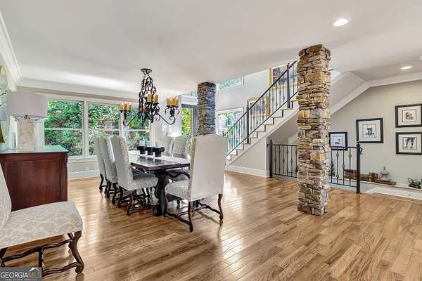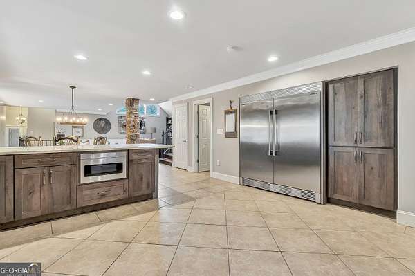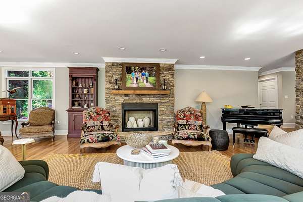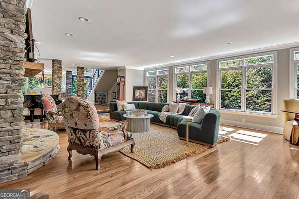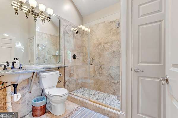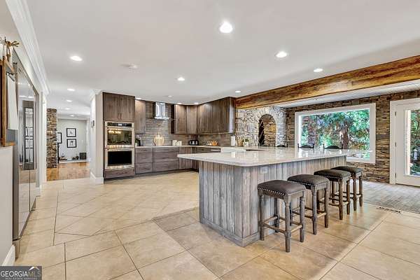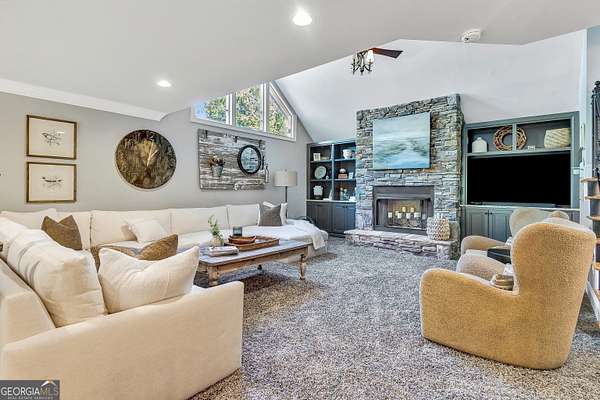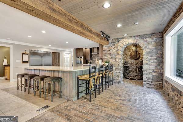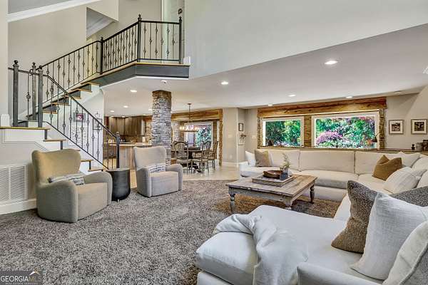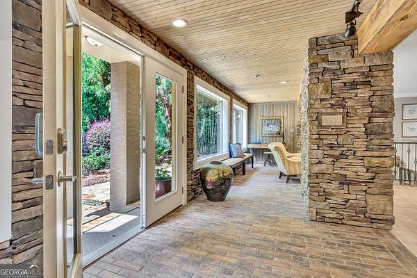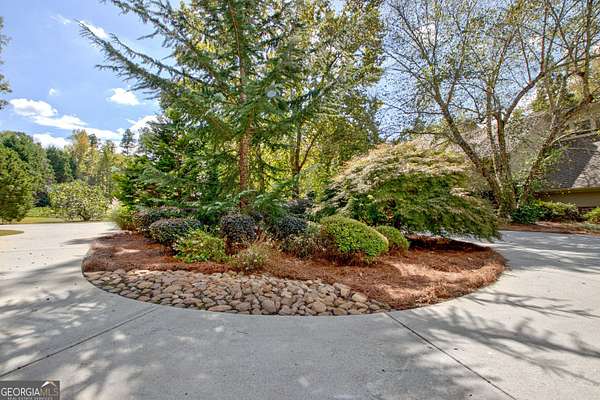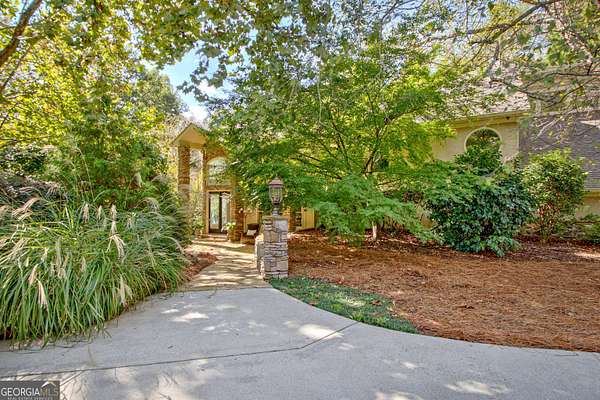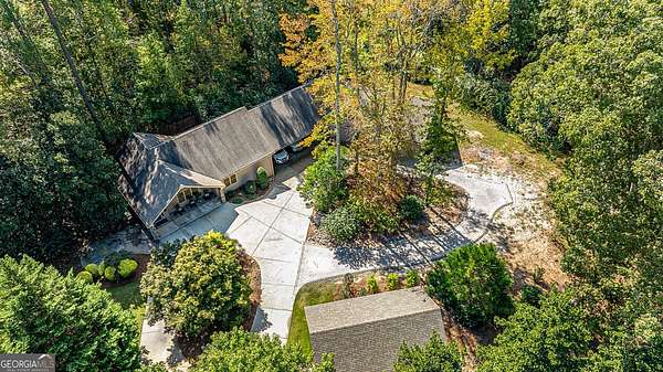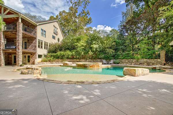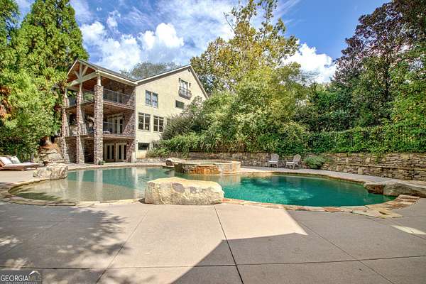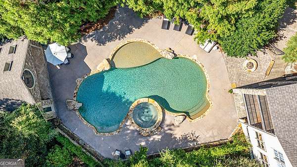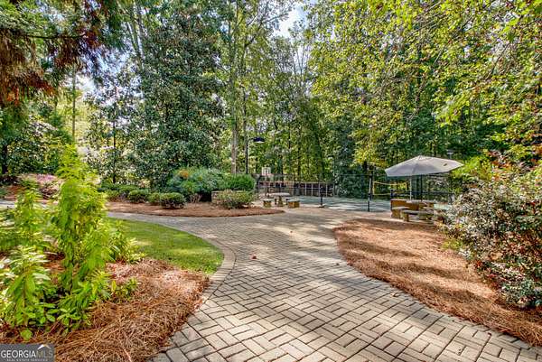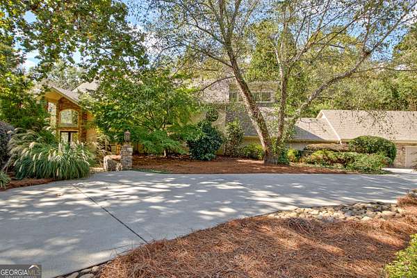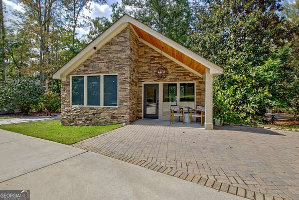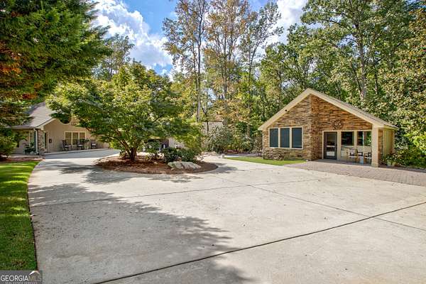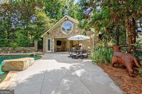 Discover this truly one-of-a-kind private, gated compound set on over 5 acres of meticulously landscaped grounds, offering three separate properties - ideal for multi-generational living. The nearly 9,000 sqft primary home offers 6 bedrooms, 4 full baths, 2 half baths, full terrace with dedicated theater room, game room, and bar for elevated living. Thoughtfully designed with two generous living areas with 2 wood burning fireplaces, a formal dining room, and a well-appointed kitchen complete with double ovens, and built-in commercial refrigerator/freezer - the home is perfect for everyday living and effortless entertaining. Rustic wood beams and stone accents infuse the home with authentic ranch-style character, and brick flooring leads to a charming wine cellar, adding to the unique appeal. In addition to the 5 bedrooms in the main home, an additional private guest suite with it's own entrance is located above the 2 car attached garage, making it ideal for teen suite, au pair living, or live-in housekeeper. A stunning 3-level deck overlooking the pool and serene landscape graces the rear of the primary home with covered porch views from the living room, primary suite and terrace level. In the backyard, the oversized pebble-finish pool and spa await, featuring tanning ledge and natural rock accents creating a resort-style setting complete with firepit. The freeform pool echoes nature and leads to the pool house with kitchenette with stone island, living room and full bath - making backyard hosting seamless. The second residence is a true stepless ranch and spans over 1300 sqft and offers 2 bedrooms and 2 baths, making it perfect for multi-generational living. With a full kitchen, living, and laundry, it is truly a second full home on the property. Attached to the second residence is a gym, expansive carport and and heated/cooled 2-car garage for the car enthusiast or woodworker, with attached office space. The third building on property which encompasses 660 sqft with half bath is ideal for a quiet workspace, creative enclave, yoga retreat, or art studio. All three residences, along with the poolhouse, are thoughtfully connected and cohesive in style and design. Shared architectural elements to include the unique round windows and curated accents create a harmonious flow throughout the property, seamlessly blending with the surrounding landscape. Approaching the primary home, a serene pond featuring a dock and pavilion offers a picturesque setting to relax. Stone and brick pathways wind gracefully throughout the property, leading to a private lighted tennis/pickleball/basketball court, expansive grassy lawns and peaceful patios nestled beneath canopies of mature trees inviting exploration at every turn. With no HOA restrictions, this estate offers the freedom to make it your own - bring your RV, boat, or add chickens to the existing chicken coups - all while enjoying the privacy and space of your own 5-acre retreat. The grassy lawn is great for football, baseball, soccer, golf, and even offers enough space for helicopter landings! Set in Peachtree City GA, a mere 15 miles from Atlanta's Hartsfield-Jackson International Airport, you will feel like you are a world away from everything, while still near first-class entertainment, retail,dining and transportation. Peachtree City offers 100+ miles of golf cart paths, and the estate is zoned for the highly-rated McIntosh High School district.