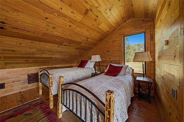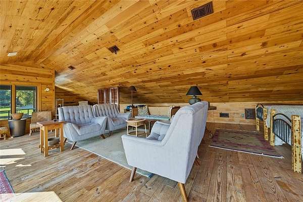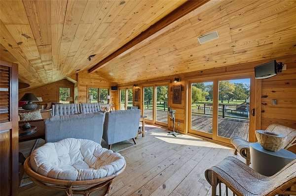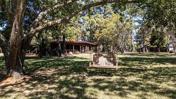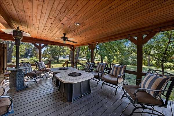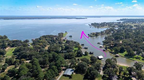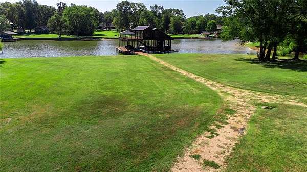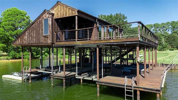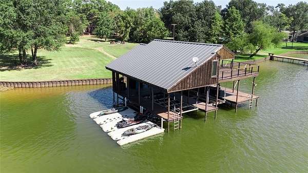 Waterfront 4 + Acre tract with so many possibilities! This tract runs along the shoreline of a deep water cove on the South end of the lake. Currently used as a family weekend retreat complete with an 1848 sq ft ultra rustic lodge style home, barn metal ceilings, reclaimed wooden floors, antler chandelier, island kitchen includes farm house apron style sink, bar seating, stone countertops, gas cooktop, built in Kitchen Aid wall of appliances stainless steel oven, microwave and refrigeration with wine chiller. The focal point is a massive stone fireplace accenting the open design great room living and game room. Built in bunk room sleeps 6 with attached full bath. Primary bedroom hosts a king size bed and full second bath. Step outdoors and you will love these breezy wrap around covered porches perfect for grilling and entertaining. Take your pick as to how to unwind! How about a little golf? There are 4 tee boxes, one large green, a zip line, hot tub, large stone firepit, a 30x40 barn or garage with roll up doors and a large sport court perfect tennis, basketball for pickle ball with some neighbors!