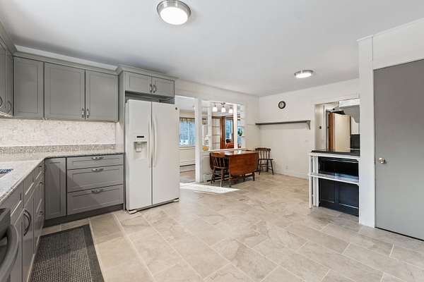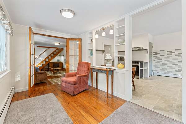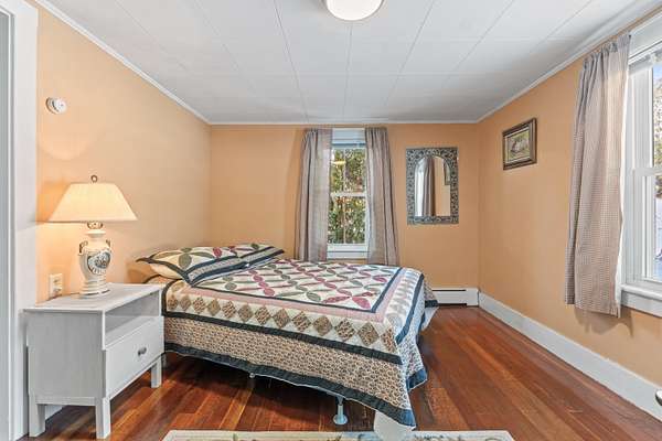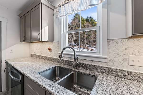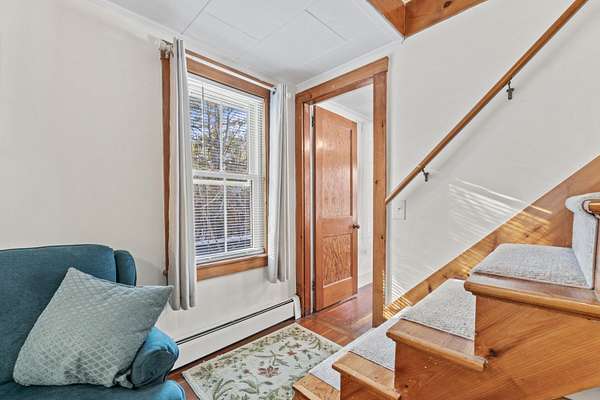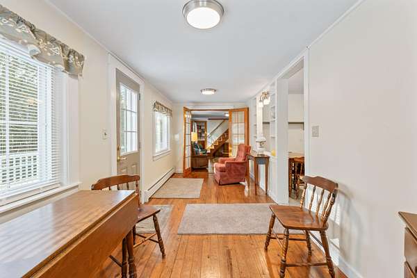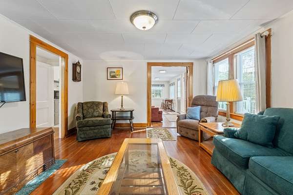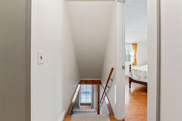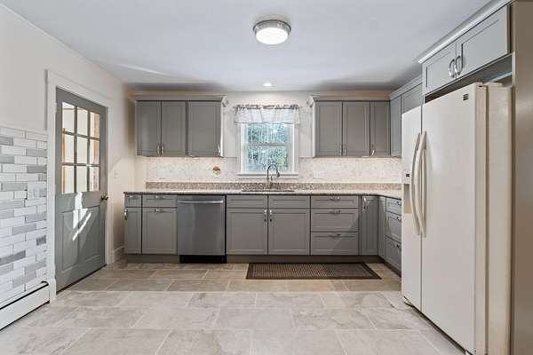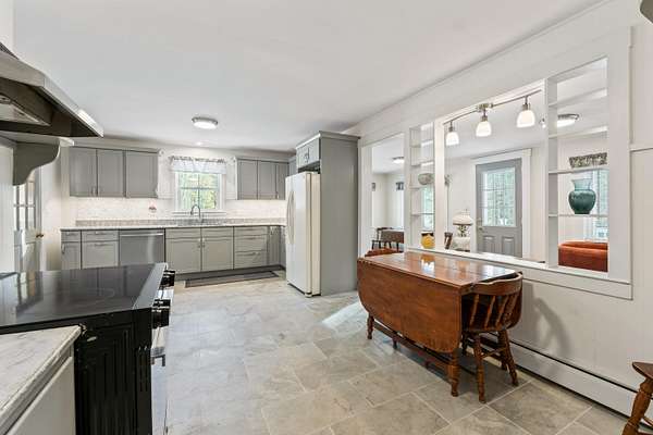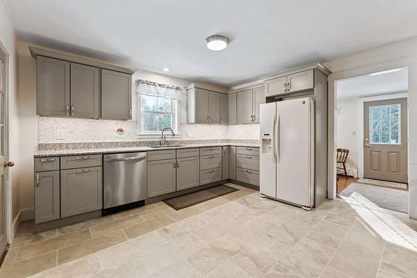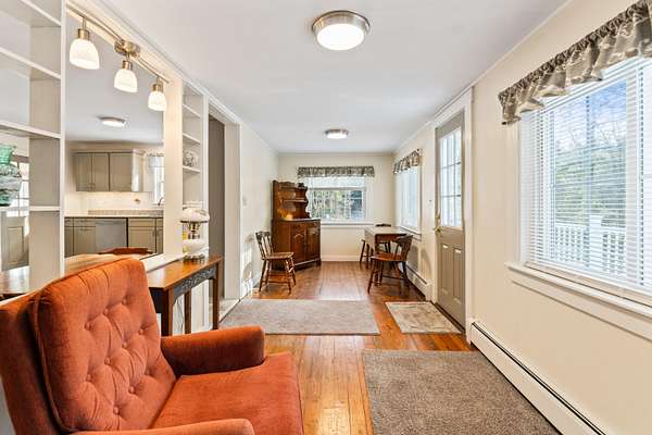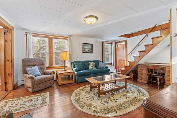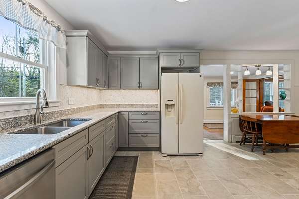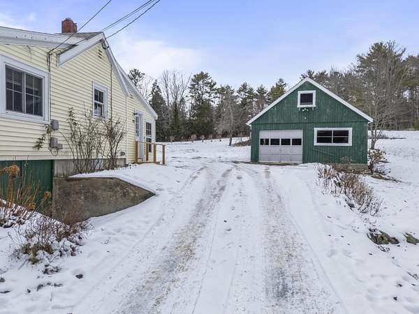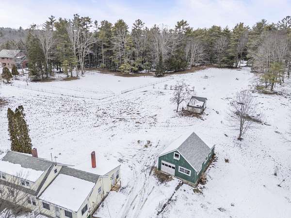 Charming 3 bedroom cape on beautiful 4.50 lot with open fields completely bordered by rolling stone walls. The cape was constructed in 1947 and remained in the family. Only two owner home. The new kitchen was installed in 2024 with granite counter top and tile floor. Off the kitchen is a 3 season sun room with large storage closets. First floor offers dining room, sitting area, living room, bedroom and office. The full bath has been updated and second area for washer/dryer. Second floor has two bedrooms, both floors having hardwood floors. Windows have been replaced over the years. There is a large 1 car garage with workshop. Changing the garage doors might allow for a two car garage. The is another out building for storage. Beautiful location, just minutes to downtown Historic Bath, Reid State Park and beach. Immaculate and ready for occupancy.