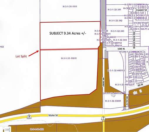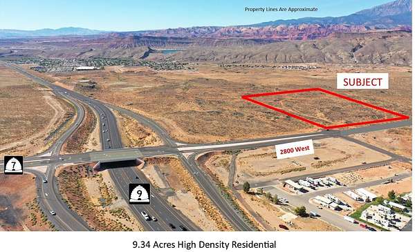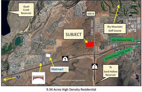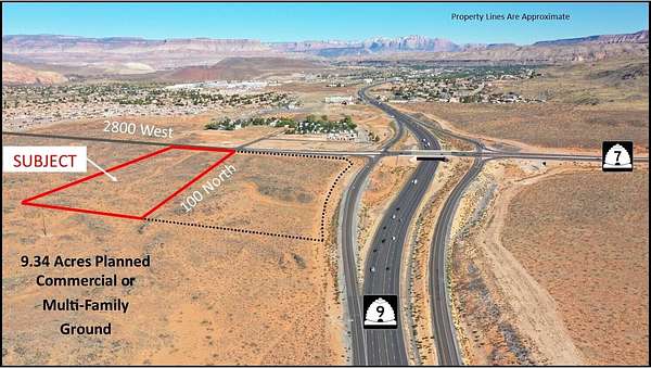 Approx. 9.34 acres planned commercial ground or multi-family residential ground. High visibility, located on SR-9 and intersection of SR-7. Adjacent to new 2800 W by-pass to 600 North corridor. See ''Documents''. Near Walmart. City will consider mixed-use apartments, townhomes, or commercial retail project. SR-7 is Southern Parkway that runs adjacent to Sand Hollow Reservoir, STG Airport, and connects to I-15 at Exit 2. Annual Average Daily Traffic count is 42,000 vehicles/day at SR-9. Lot split from parcel H-3-1-31-1101. Taxes are prorated estimate. Adjacent 14.61 acre parcel available MLS 25-258516. Acreage is an estimate. Final acreage determined by lot split as approved by the City.