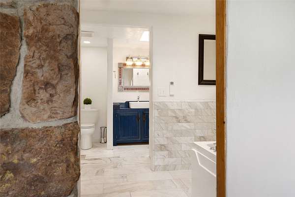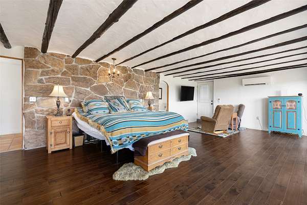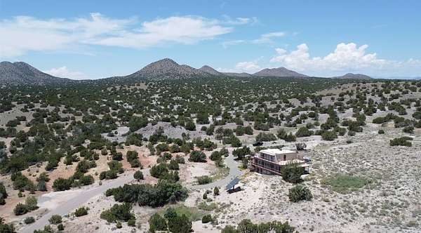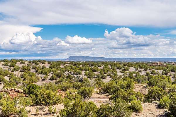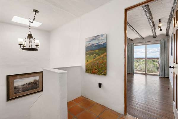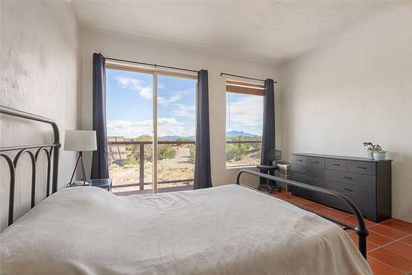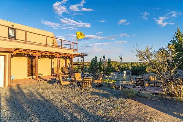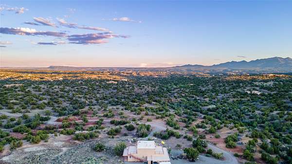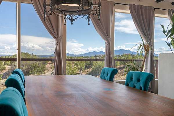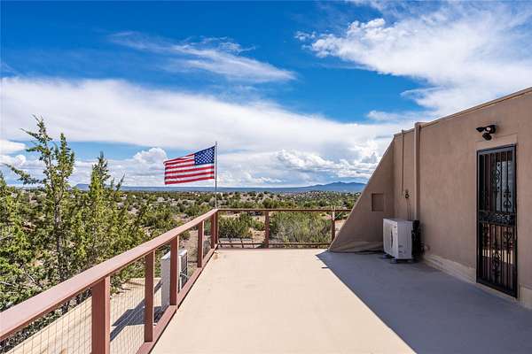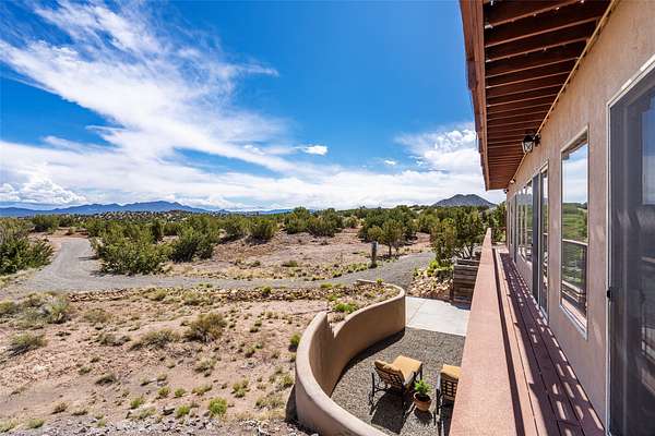 Views, privacy, and 16 acres of gently rolling hills covered in juniper, mountain mahogany, and pinon await you at this home in the highly desirable Rancho Alegre community just south of Santa Fe. Enjoy stunning views from nearly every room. The open-concept living, dining, and kitchen area offer expansive windows overlooking the surrounding landscape. The space features 10-foot ceilings with vigas, walnut hardwood floors, locally hand-forged chandeliers, and beautiful stone accent walls. The kitchen boasts high-end appliances, granite countertops, and a Lacunza wood-burning stove. On the main floor, you'll find two bedrooms, both with outdoor access, and a shared bathroom. Follow the Saltillo steps with Talavera tile risers to the spacious owners suite featuring views from multiple balconies and a spa-like bathroom. Relax with the Mr Steam dream shower and 2-person jetted tub surrounded by marble flooring. Stay active with the home gym or explore the miles of community trails. Watch a movie in the fully equipped theater room or walk nearby to the movie ranch. Enjoy clean water from a productive well, equipped with new pump, cistern, and multi-stage filtration. Stay comfortable all year with programmable mini-splits throughout the home, and owned solar panels keep cost down. The regraded, graveled driveway and excavated pad provide space for RV/toys, a horse barn, or casita. No HOA, around 25 min to Plaza, Canyon Road, or Railyard, and 50 min from ABQ Intl Airport.