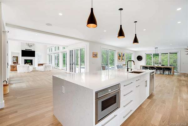 A buyers dream rooted in nature, enhanced by design. This modern farmhouse nestled in the heart of Shelter Island, NY. completed in 2024, sits on a generous 2.16 acres of immaculate grounds, is a mere half mile from the South Ferry, placing convenience at your doorstep. Boasting six bedrooms, each with their own en-suite, and two additional half-baths, this residence effortlessly blends style and function. The open floor plan is an entertainer's dream, seamlessly connecting the living, dining, and kitchen areas. The expansive living room showcases large vaulted ceilings with a floor to ceiling doors with transoms, inviting an abundance of natural light into the space, creating a warm and welcoming atmosphere with an indoor outdoor flow. The kitchen is a culinary delight featuring high-end stainless steel appliances, modern shaker style cabinetry, a wet bar, and pantry. The design is thoughtful and efficient, making it the perfect place to prepare meals and entertain guests. The primary suite, located for optimal privacy, is a sanctuary of peace and relaxation. It features a double shower with steam, creating a spa-like experience within your own home. The second-floor hosts three additional en-suite bedrooms, one of which has its own private deck, offering a tranquil space for morning coffee or evening reflection. The lower level presents a TV room and two more en-suite bedrooms, offering flexibility for various lifestyle needs. The property also includes a heated gunite pool, a large tiled patio, and a pickle ball/sport court, promising endless outdoor entertainment. The entire home is unified by stunning white oak flooring and complemented by well-thought-out outdoor landscape lighting, emphasizing the property's architectural beauty. The community environment is as inviting as the home itself. With easy access to local amenities and the South Ferry, residents can enjoy the best of Shelter Island living but also having the convenience to the "Sag Harbor Village" and "The Hamptons". Experience the perfect blend of modern luxury and comfort in this well-designed home. No expense was spared in creating this oasis.