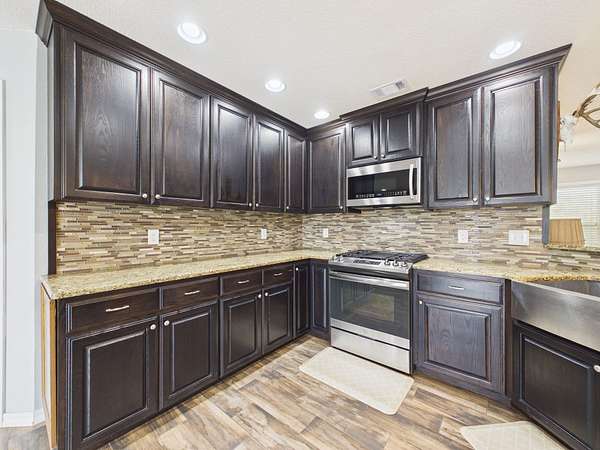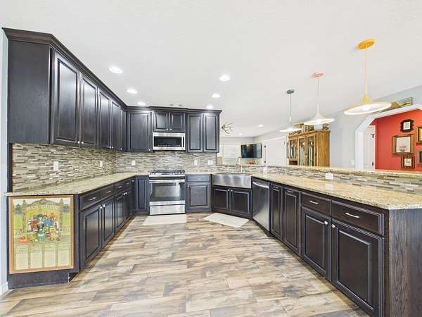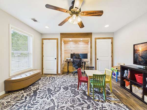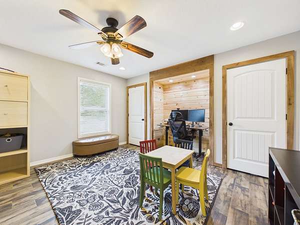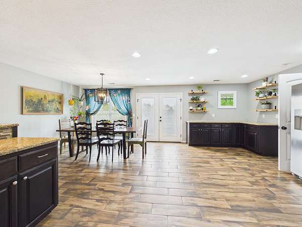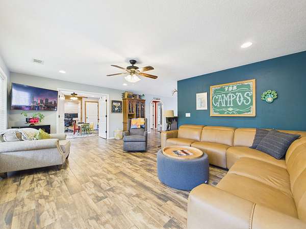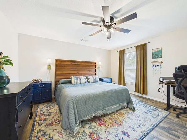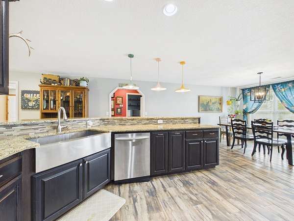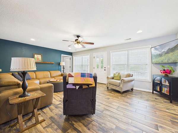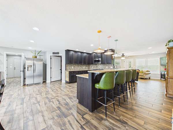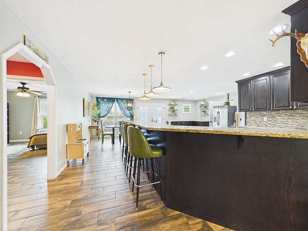 Step onto the inviting front porch and into a spacious living room filled with warmth and natural light. Just off the living area is a flexible space that could easily serve as a home office, guest room, or additional bedroom. The home flows effortlessly into a dining area and a well-designed kitchen featuring a large bar with seating for 4–6—perfect for gathering, entertaining, and making memories. Tucked into the corner, you’ll also find a charming designated coffee bar area with lots of cabinets and counterspace—just right for slow mornings or winding down in the evenings.