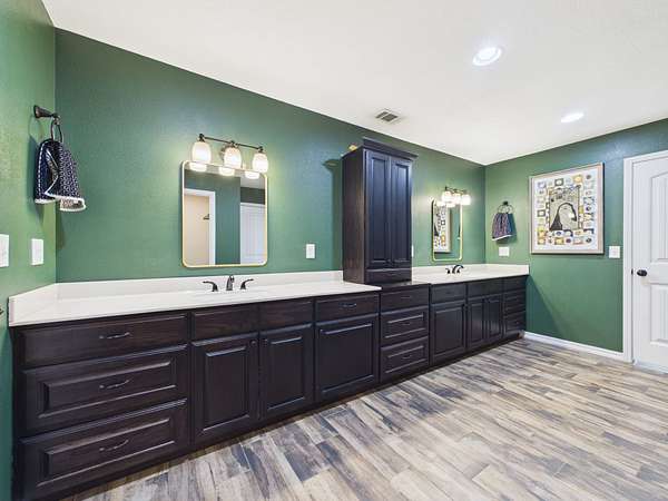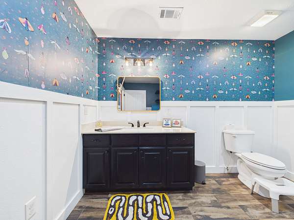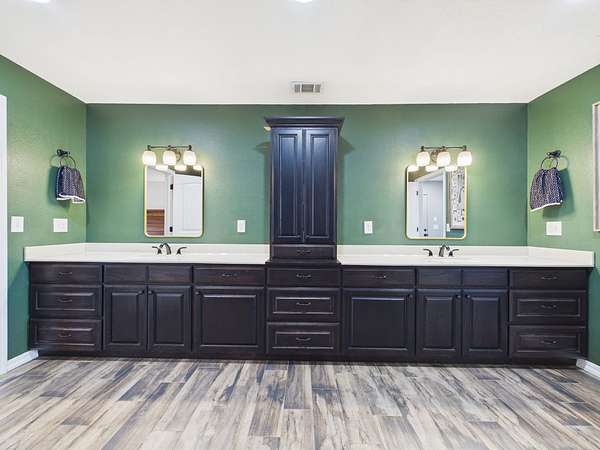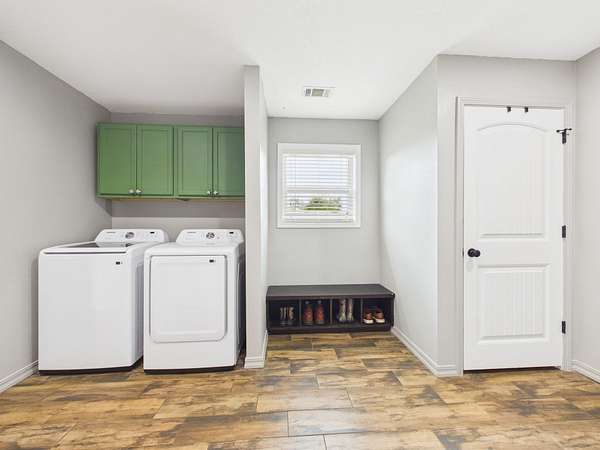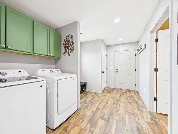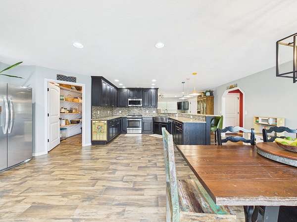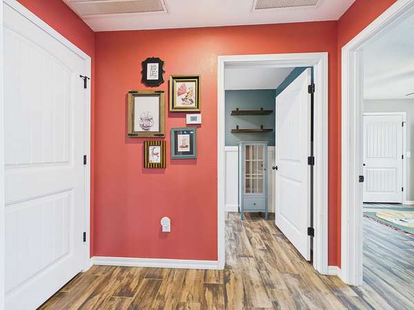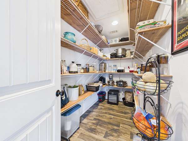 Just off the kitchen is a spacious walk-in pantry that adds both convenience and a thoughtful touch—step inside and the light automatically comes on, revealing shelving all around, making it easy to stay organized and keep everything within reach.