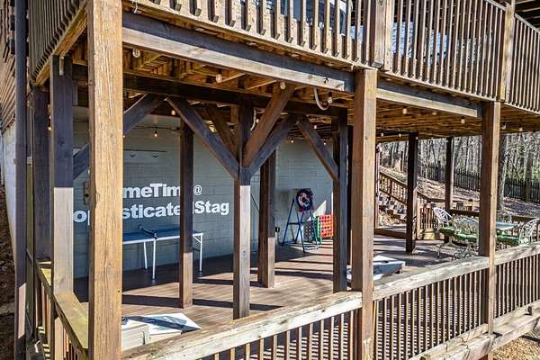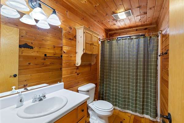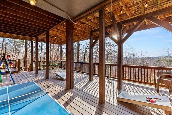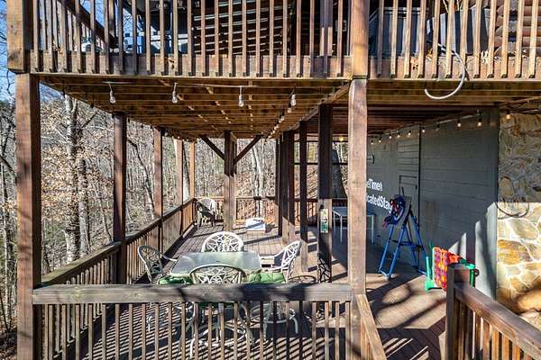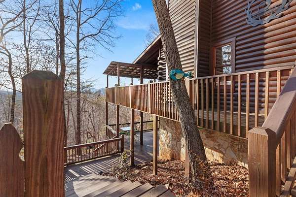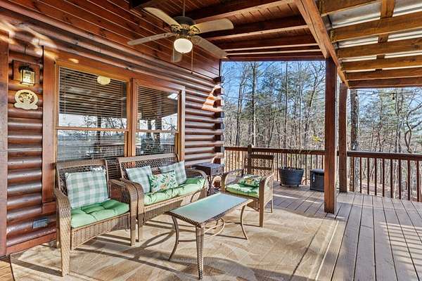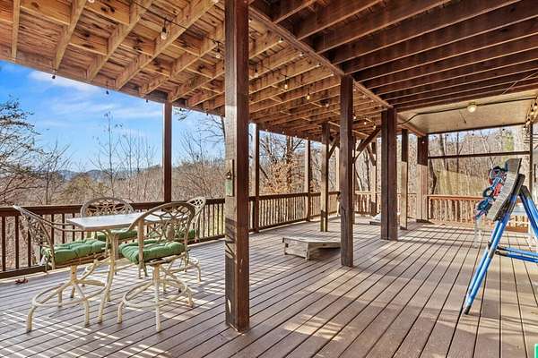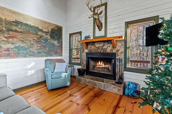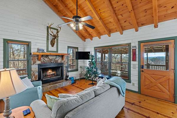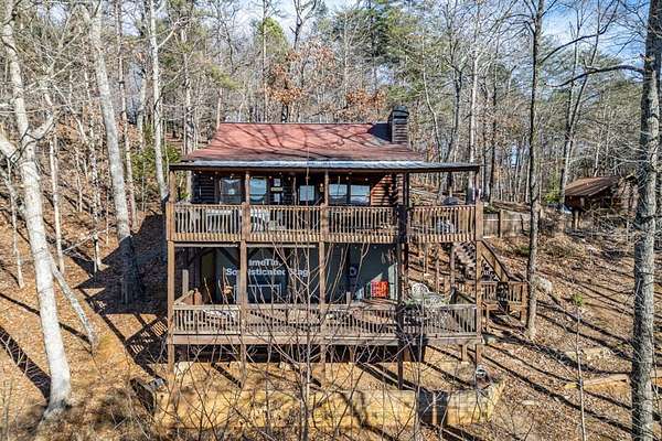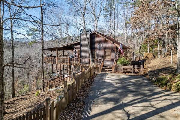 Experience peaceful mountain living in this inviting rustic cabin nestled in the trees of Cherry Log, complete with beautiful long-range mountain views. Designed for comfort and easy living, this one-story home combines classic cabin charm with modern conveniences throughout. Inside, vaulted ceilings and warm wood floors create an open, welcoming atmosphere in the great room, anchored by a cozy wood-burning fireplace. The kitchen flows seamlessly into the dining area, where expansive windows frame the surrounding mountain scenery. A small open loft offers flexible bonus space for an office, reading nook, or additional sleeping area. Two guest bedrooms, a full bath, and a conveniently located laundry closet complete the main living level. Outdoor living is where this cabin truly shines. Enjoy the mountain backdrop from the covered patio or lower-level deck, unwind in the hot tub, or gather around the fire pit for evenings under the stars. The property features gentle sloping land, road frontage, lake access, and a concrete driveway, making year-round access simple and convenient. Located in the scenic Cherry Log community, this home offers a quiet mountain setting while remaining close to Blue Ridge, local dining and shopping, popular hiking trails, and nearby lake recreation. Furnishings are negotiable, allowing flexibility for your personal vision. Whether you're seeking a full-time residence, a weekend escape, or an investment opportunity, this cabin offers the perfect mountain retreat.