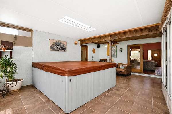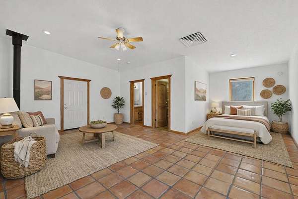 An Elevated Southwest experience on 5.75 acres set against breathtaking Red Mesas of Jemez, capturing expansive VIEWS & exceptional seclusion in a private end of road setting. Enter through courtyard garden into great room, high wood beam ceilings & Radiant Saltillo tile throughout. Spacious kitchen w/ island opens seamlessly for gathering & entertaining. Meticulously cared for, this property reflects lasting quality. Beautiful, spacious primary suite w/ private bath & walk in closet. Comfortable enclosed sunroom w/ hot tub for year round relaxation. Outside, Casita beautifully finished in matching materials, perfect for guests or multigenerational living. Newer TPO roof, 2 fireplaces, laundry room, oversized finished 2 car garage w/ workshop & generator, plus additional studio & RV hookup