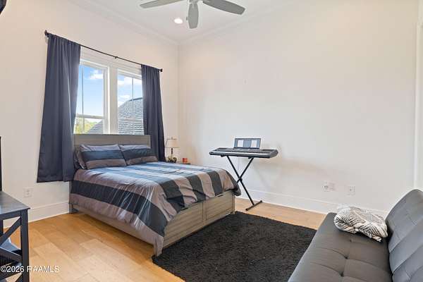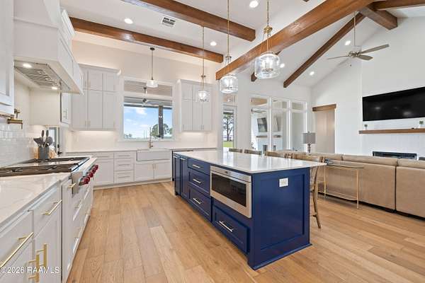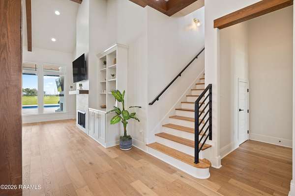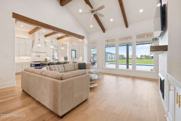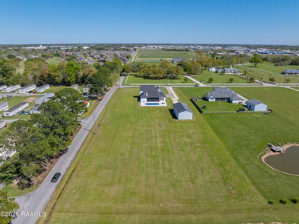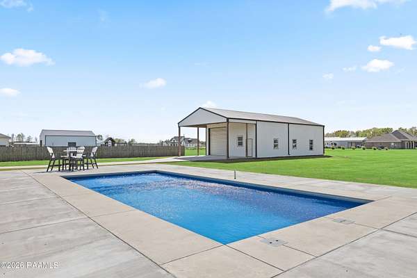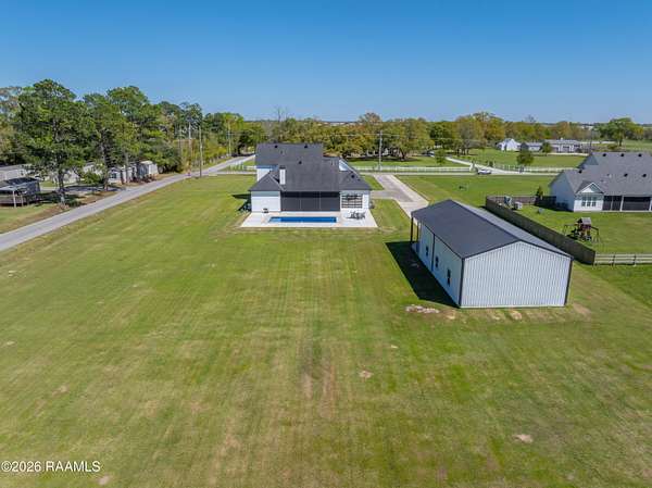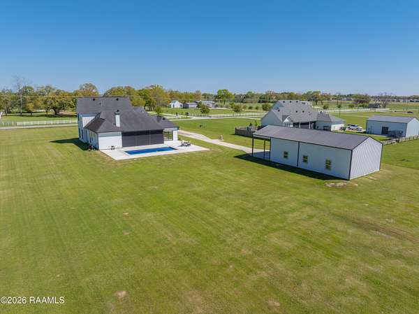 Situated on approximately 2.4 acres in Youngsville and currently priced below recent appraisal, this exceptional modern farmhouse estate offers luxury country living just minutes from the Youngsville Sports Complex and Southside High School. With 4 bedrooms, 3 full baths, and 2 half baths across approximately 3,650 square feet, this thoughtfully designed home blends timeless farmhouse charm with upscale finishes and modern amenities.The open-concept layout features soaring ceilings with exposed beams, detailed crown molding, custom built-ins, a wet bar, and two gas fireplaces creating a warm yet refined atmosphere. The chef's kitchen is equipped with premium appliances including a 48'' Wolf range, Sub-Zero refrigerator, quartz and granite countertops, and a spacious walk-in pantry, making it ideal for both everyday living and entertaining. The private primary suite offers a luxurious retreat with a spa-inspired bath featuring a freestanding soaking tub, separate shower, and generous walk-in closets. Throughout the home you'll find wood and tile flooring, high-end finishes, and an abundance of natural light. Outdoor living is equally impressive with a screened-in back patio overlooking a heated in-ground pool (plumbed for a future waterfall feature) and a fully equipped outdoor kitchen complete with an island, sink, RCS grill, side burner, and beverage refrigerator--perfect for entertaining year-round. Additional highlights include a 20' x 40' detached workshop with plumbing and roll-up door, a three-car garage, 25KW whole-home generator, tankless water heater, and durable HardiPlank siding with metal roof accents. The level 2.4-acre homesite provides ample space for recreation while offering the privacy of a quiet paved parish road. With its combination of acreage, luxury finishes, resort-style outdoor space, and functional workshop, this property presents a rare opportunity for buyers seeking space, privacy, and convenience in the Youngsville area.
