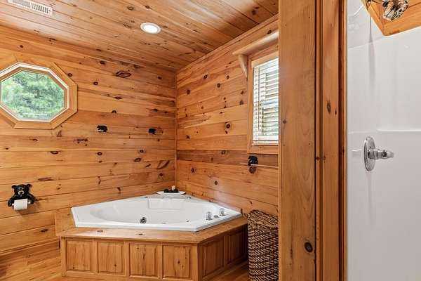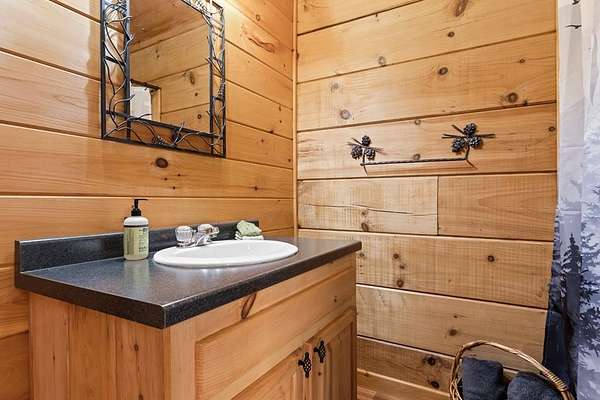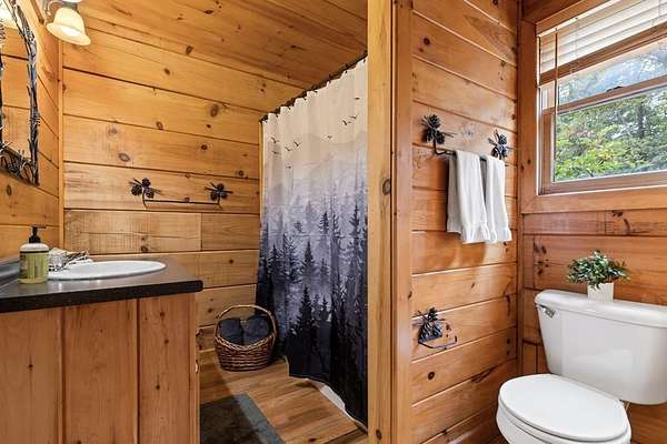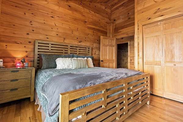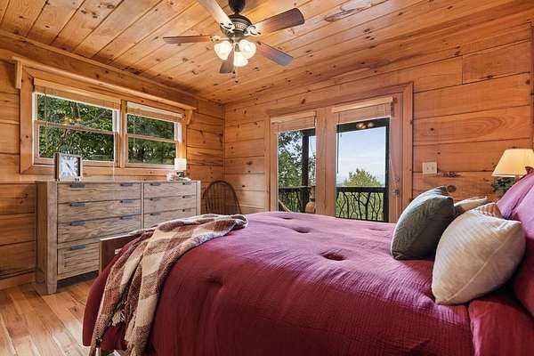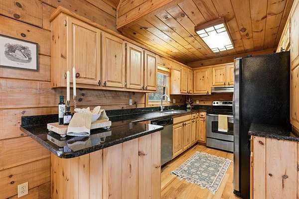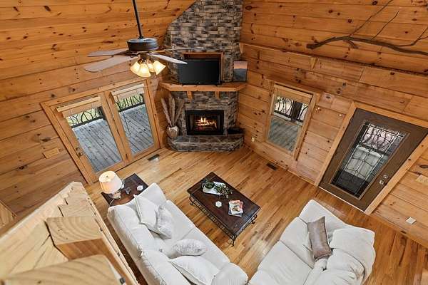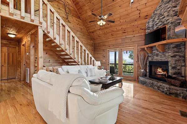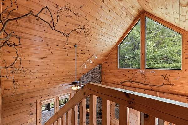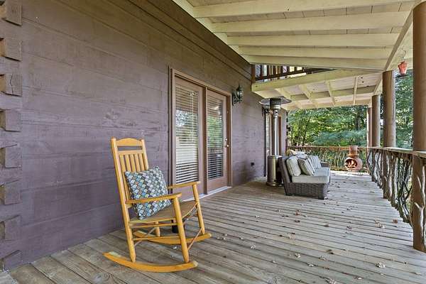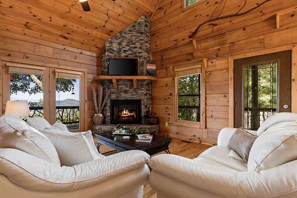 Perched amidst vibrant mountain laurel, this enchanting 2-bedroom, 2-bathroom cabin delivers a treehouse-like escape, seemingly suspended atop a mountain with multilayered, long-range views stretching for miles. Tailored for outdoor enthusiasts, this property is a prime short-term rental investment, offering seamless access to hiking trails, biking paths, and pristine wilderness. With a partially finished basement and potential for a third-level addition, this cabin is ripe for transformation into a high-demand retreat for adventure-seekers. Step inside to a warm, open-concept living space that instantly welcomes guests with its rustic charm. Soaring tongue-and-groove ceilings create an airy, inviting atmosphere, while the cozy stone fireplace serves as a perfect gathering spot for chilly evenings after a day of exploration. Large windows flood the interior with natural light, showcasing breathtaking, multilayered mountain vistas that make renters feel immersed in the treetops. The functional kitchen, equipped with custom wood cabinetry, is well-suited for preparing hearty meals or quick snacks, catering to groups eager to refuel for their next outdoor adventure. The upstairs primary suite is a standout feature, offering a spacious, restful haven with private access to a covered balcony area--a secluded perch where guests can savor morning coffee or evening drinks while enveloped by the serene beauty of mountain laurel and endless views. Its en-suite bathroom provides modern comfort, large jetted tub ensuring a luxurious stay. The second bedroom off of main level with French doors that lead out onto the deck. The unfinished basement offers boundless potential to create a game room, extra sleeping quarters, bathroom or storage for hiking, biking, or climbing gear, enhancing the cabin's appeal to outdoor adventurers. Outside, the expansive covered porch is a guest magnet, offering a front-row seat to the multilayered mountain panorama.