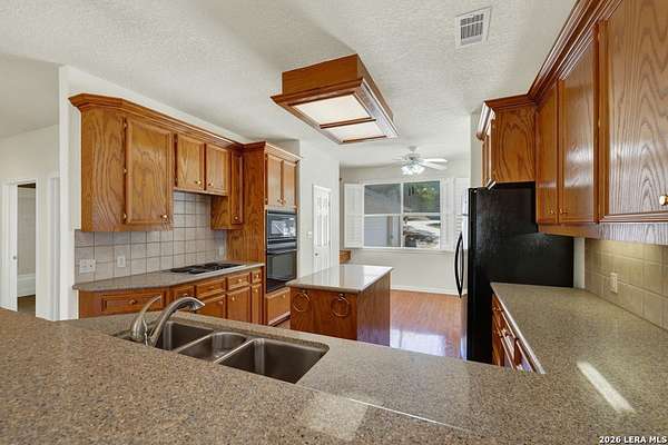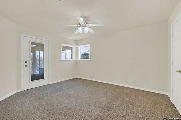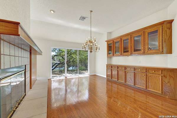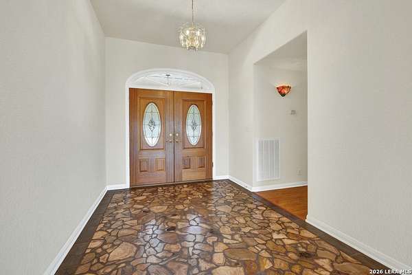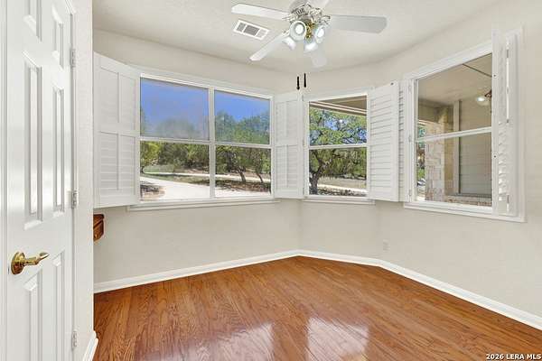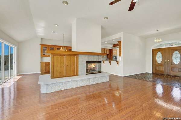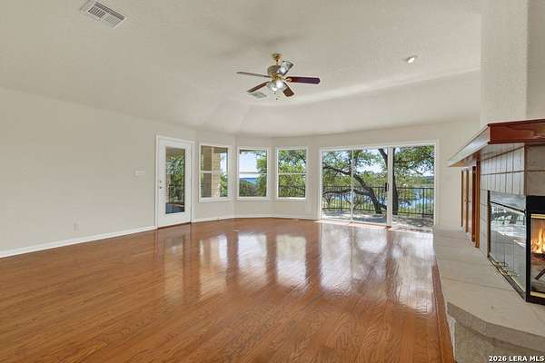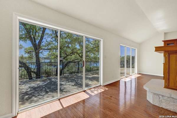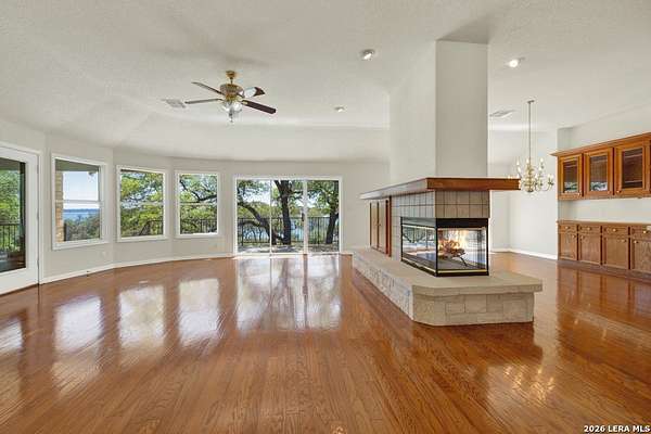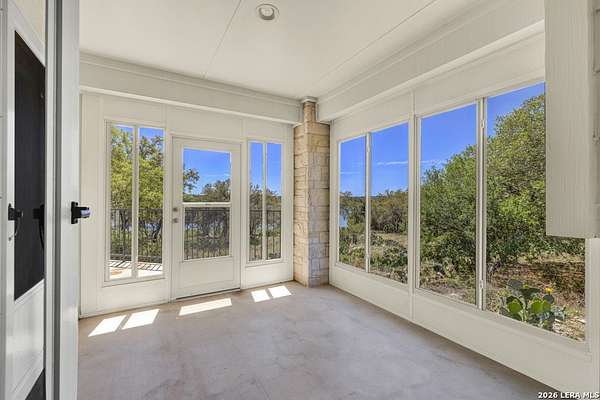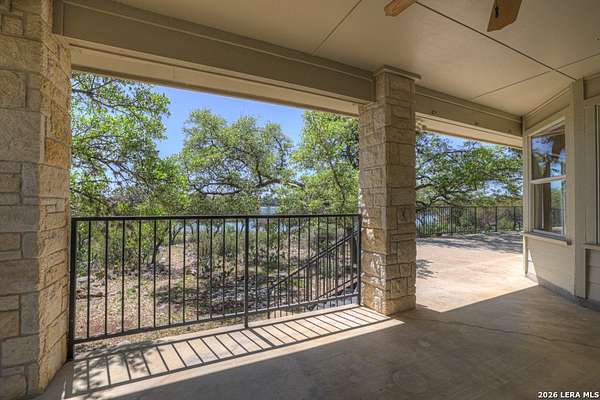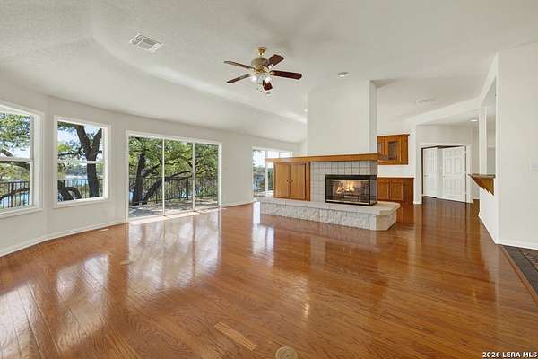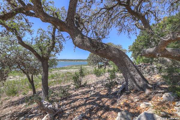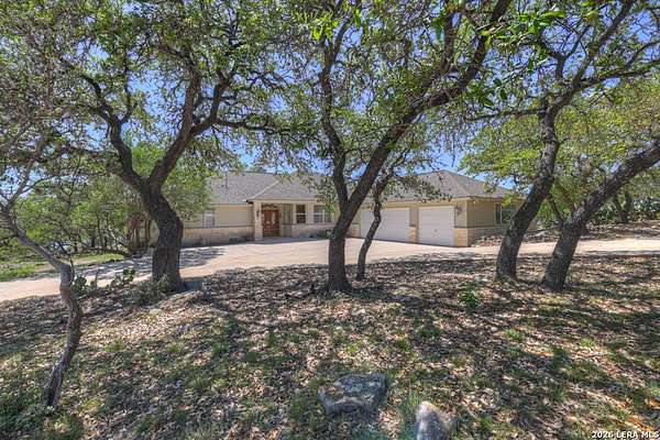 Tucked away on 4.16 acres with an impressive 335 feet of accessible waterfront, this exceptional Canyon Lake property is a rare and remarkable find. Surrounded by mature oak trees and natural landscaping, the setting offers unmatched privacy and tranquility, where wildlife such as deer, foxes, roadrunners, and native birds are part of your everyday view. From the back porch, take in breathtaking sunrises and sunsets over the water, an experience that never gets old. A circle driveway provides effortless access and ample parking, while the home itself has been meticulously maintained. Step inside to a one-of-a-kind foyer featuring painstakingly hand-cut petrified wood from the homeowners collection, setting the tone for the unique character found within. The main living areas showcase rich oak hardwood floors and a three-sided stone fireplace that anchors the space with warmth and charm. Expansive windows and glass doors flood the home with natural light and frame picturesque lake views. The open-concept kitchen flows seamlessly into the dining and living areas, making it perfect for both everyday living and entertaining. A dedicated office features built-in cabinetry and shelving, along with direct access to a sunroom, ideal for work or relaxation. The spacious primary suite offers new carpet, a walk-in closet, and a bathroom complete with a jetted tub and walk-in shower. Additional features include plantation shutters, a central vacuum system, an oversized mudroom with durable concrete flooring, a true "Butler's Pantry" and a three-car garage. This property is serviced by a private well and is plumbed for a water softener. Major updates include a new roof in 2022 and exterior paint completed just two years ago. Whether you're seeking a serene waterfront retreat or a one-of-a-kind primary residence, this Canyon Lake gem delivers space, beauty, and timeless appeal with room to add on.