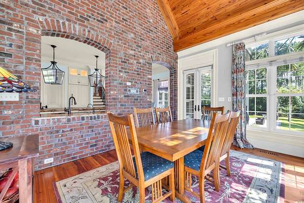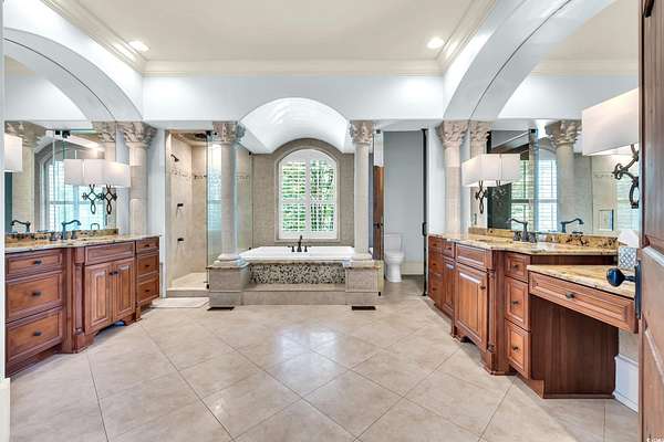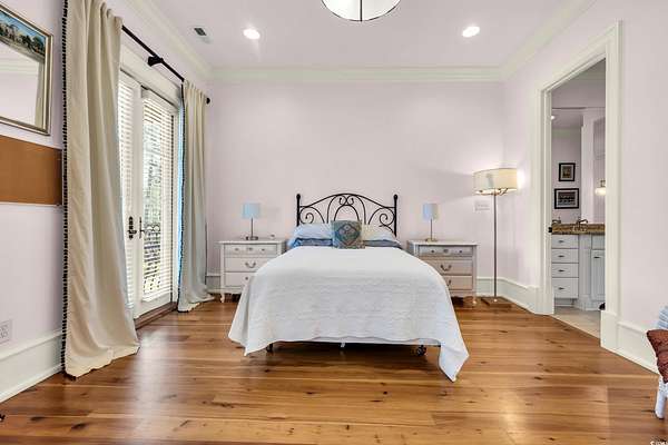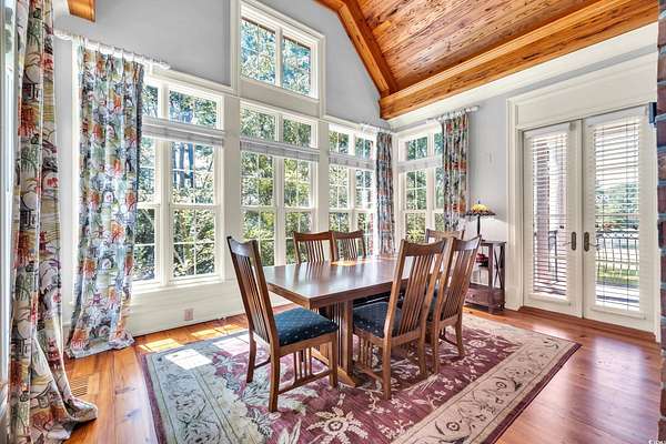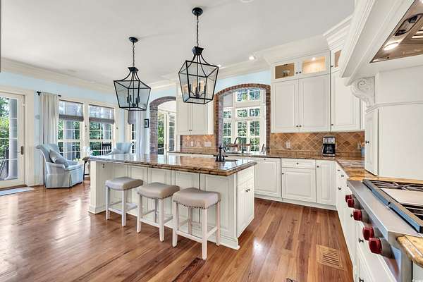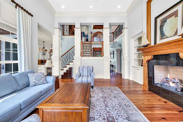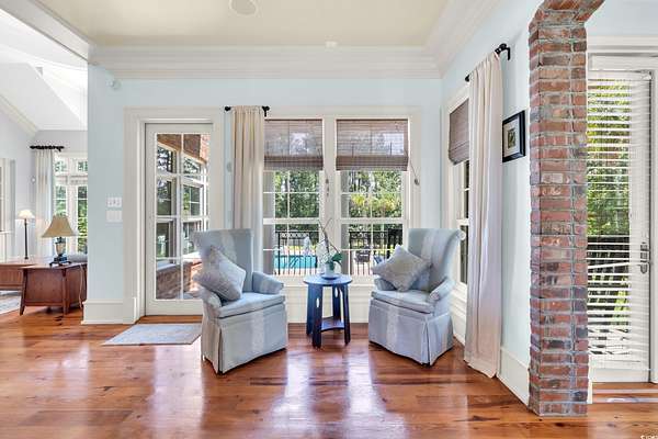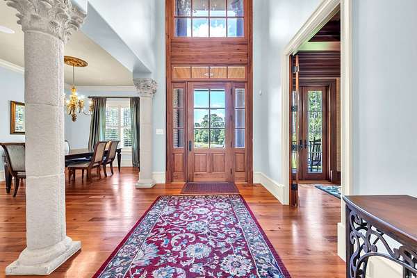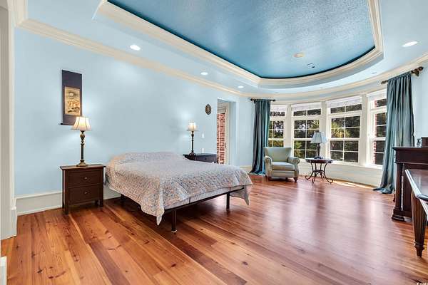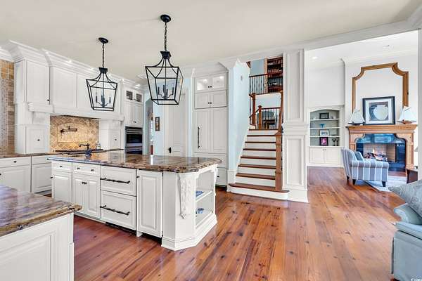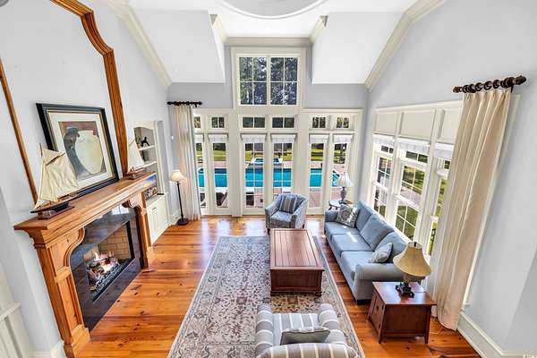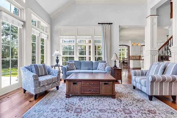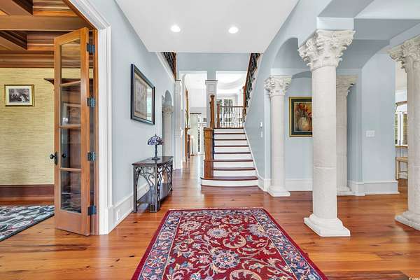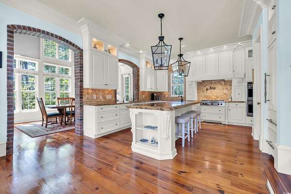 Sprawling home estate on more than 21 acres, only 30 minutes from the beach in Loris, SC. This gorgeous, 4 bedroom, 4 1/2 bathroom, brick custom home was built in 2007 with top-of-the-line craftsmanship and materials. Tremendous curb appeal as you enter through the wrought iron gates and brick entrance passing by the two stocked ponds with fountains in both. Surrounded by woods with lots of privacy and ample lawn space. Large, heated saltwater pool with tanning ledge, hot tub, and waterfall with open patio area with lots of space to entertain, gorgeous landscaping, asphalt drive and circle driveway with large brick paver parking area. The exterior of the home consists of brick walls, decorative columns, stucco accents and 7 expansive tiled balconies with wrought iron railings and gas lanterns on front porches. There is private side access to the 3-car garage, well-kept grounds, and a fenced in yard. Beautiful brick steps lead to the custom wooden entry door. It continues inside with so much attention to detail with custom accents, wood flooring, custom tile, soaring upgraded ceilings throughout with tray/co?ered/wood, every door is custom made for its space, high end windows and doors, formal dining room, sunroom with brick wall and wood ceiling, large living room with huge windows overlooking backyard and pool, propane fireplaces in living room and o?ce with a gorgeous wood hearth, built-in bookshelves, beautiful molding everywhere, wide baseboards, extra-large crown molding, extensive window/door casings, rounded sheetrock corners, interior brick accents, separate o?ce with double doors and built-in wood shelves, custom window treatments, granite countertops throughout, tile backsplash, custom cabinetry with high end appliances, Sub-Zero refrigerator, Wolf gas stove, double ovens, pot filler, range hood, in-cabinet freezers, ice maker, walk in pantry, huge chandelier at foyer with push button lowering for cleaning, large primary suite with access to backyard, sitting area, nice primary bathroom, walk-in tiled shower with multiple shower heads, double sinks, jetted tub, huge primary closet with custom shelving, uplighting in tray ceiling, wood steps with multiple access points with nice spindles going upstairs, large secondary bedrooms with walk in closets, laundry room with cabinets and a sink, fully encapsulated extra-large crawlspace with so much available storage space. This exquisite property has it all with so much detail inside and out!