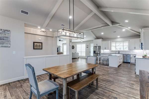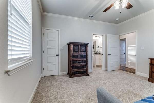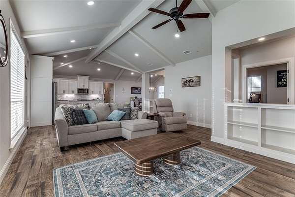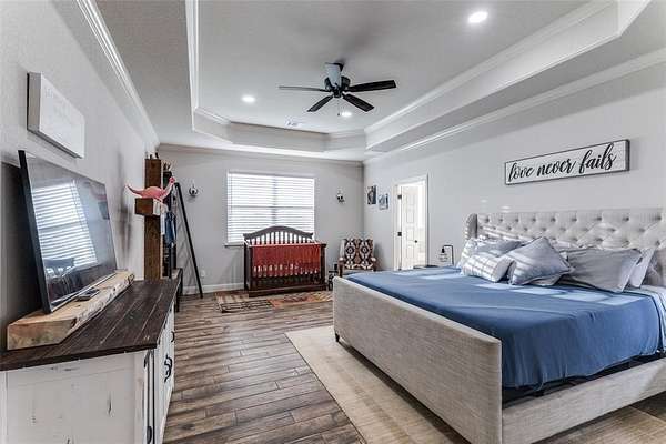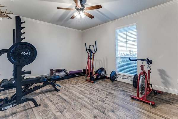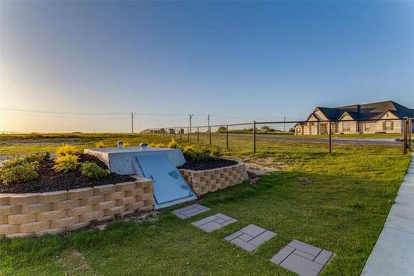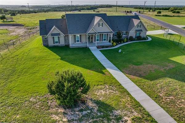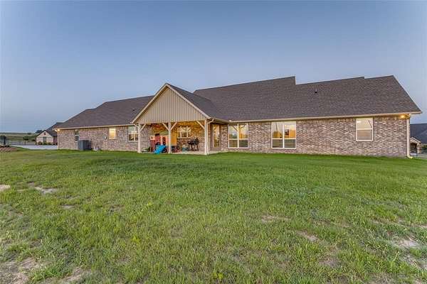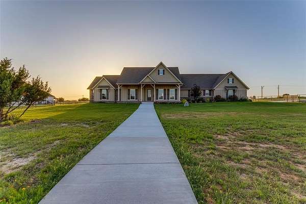 Featuring panoramic sunset views of the Brock countryside, this beautiful 5 bdrm single story modern luxury ranch home on a 2-acre corner lot sits at the entrance to the exclusive gated Eagles Bluff community. The spacious front porch invites relaxation and outdoor enjoyment with serene views. Inside, enjoy the grand open area floor plan that seamlessly connects the kitchen, family and dining areas to making it ideal for entertaining. A designated office space with built-in desk and shelves offer the perfect work from home solution. Energy efficiencies to maintain lower utility costs include spray foam insulation and a well water system. Recent updates totaling about $47k include pipe fencing with a yard gate and sliding gate at the driveway, sidewalk, water filtration system, blinds, and storm shelter.