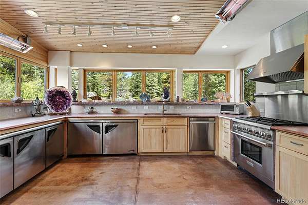 - Chef’s Domain: A professional-grade kitchen fully equipped with overhead and french doors, triple-depth granite countertops, and infrared heaters, in-floor heating, built in expansive refrigeraton units, 180 degree windows, Wolf Range Oven, and more.