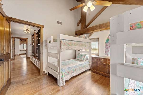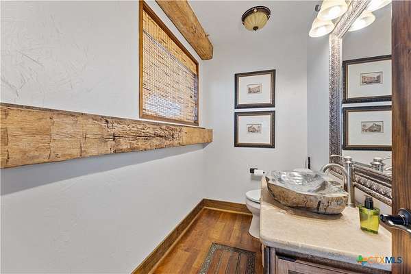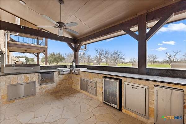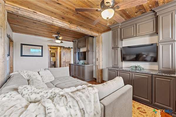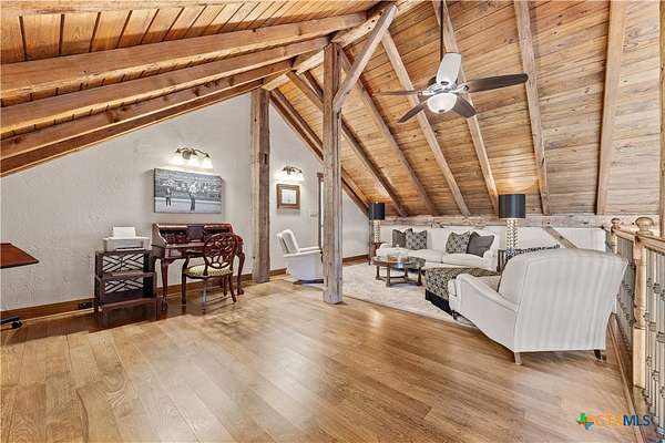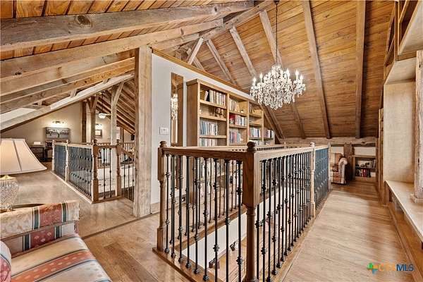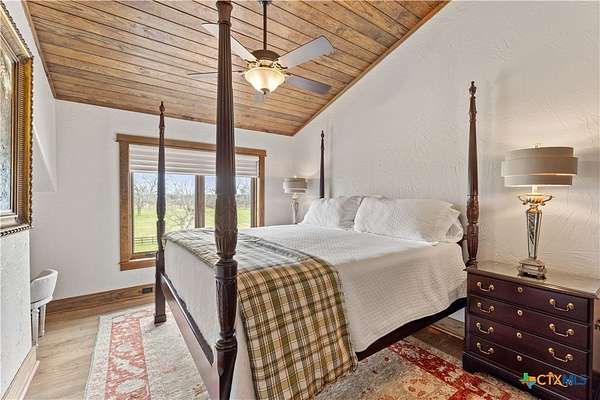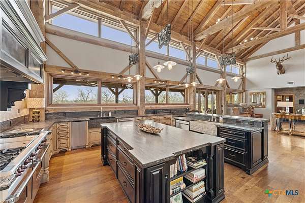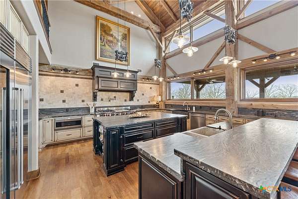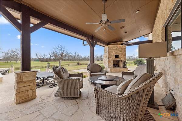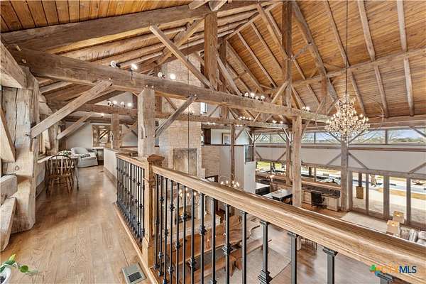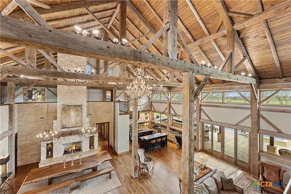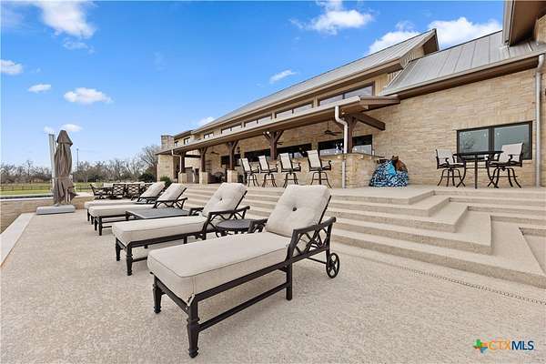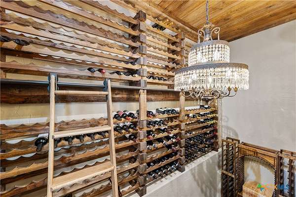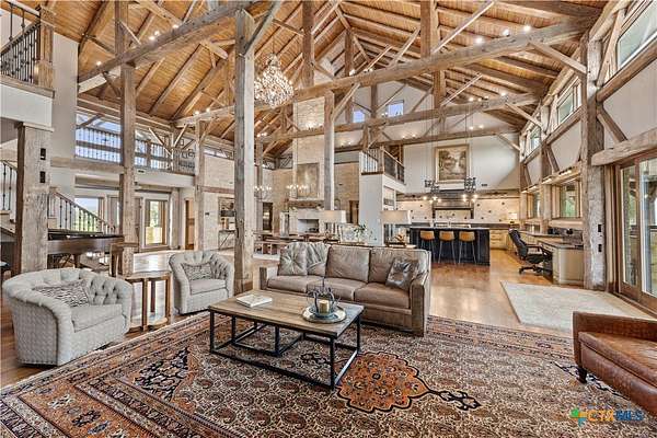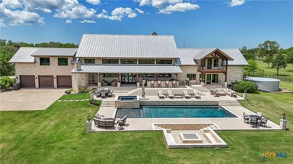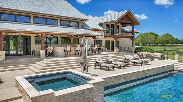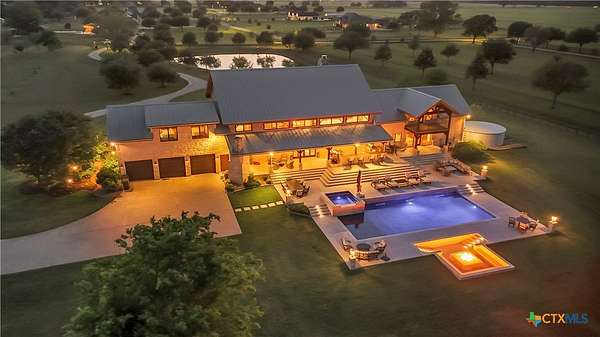 Welcome to 1000 River Trace Dr., a private, gated riverfront estate in the exclusive Providence Landing neighborhood, just one hour west of Houston. This 6,054 sq ft custom home offers 6 bedrooms, 4.5 bathrooms, and extraordinary craftsmanship supported by 200-year-old Hemlock timbers. Nestled on 22.74 acres with 415+ ft of Colorado River frontage and a 4-acre private sandy beach, the property also features a stocked fishing pond with dock, circular drive, and stunning curb appeal. Inside, enjoy soaring ceilings, mesquite and hickory hardwood floors, natural stone fireplace, and high-end finishes throughout. The gourmet kitchen boasts dual islands, two sinks, Sub-Zero fridge/freezer, Wolf range with grill, griddle, and double ovens, plus two dishwashers-perfect for entertaining. Just off the main living area, a hidden sunken wine cellar adds a touch of elegance and function. Step outside to a resort-style oasis with sparkling pool, spa, sunken fire pit, and a fully equipped outdoor kitchen with pizza oven, grill, smoker, ice maker, and dishwasher. The primary suite is a luxurious retreat featuring a private loft, two-story custom closet, exterior pool access, a sunken acoustic tub, and a digitally controlled shower with 17 heads and built-in speakers. Additional amenities include a whole-house generator, 20,000-gallon rainwater collection with UV filter, 3-car insulated garage with EV charger, smart home features, central vacuum, and a rare climate-controlled basement housing all mechanical systems. Ag-exempt with bee hives conveying. This is a one-of-a-kind Texas estate blending modern luxury, timeless materials, and unmatched natural beauty.