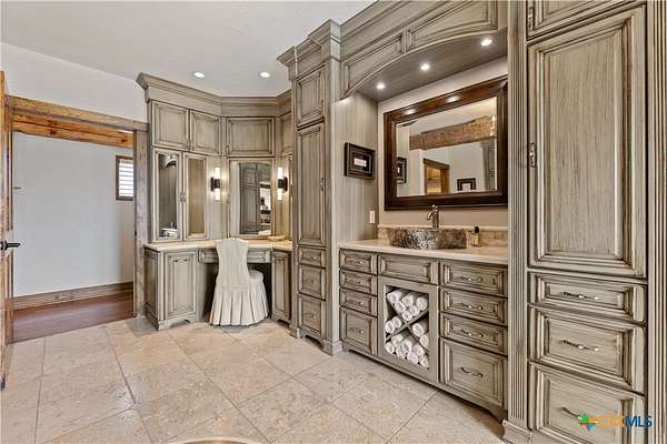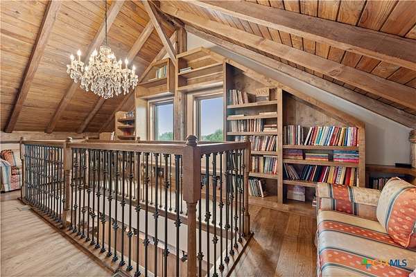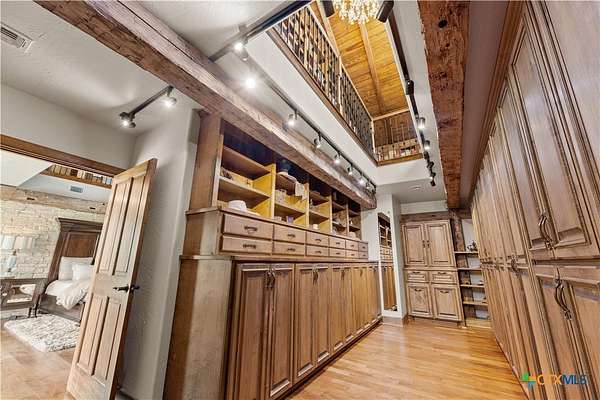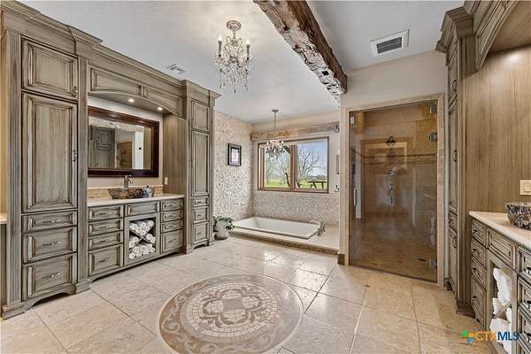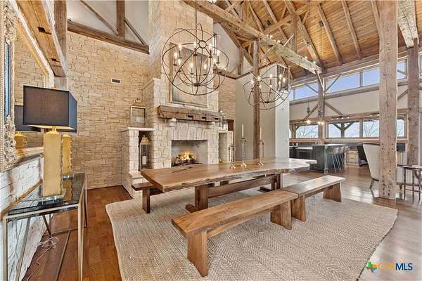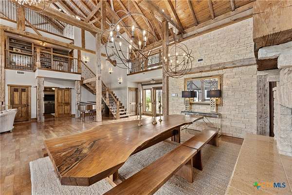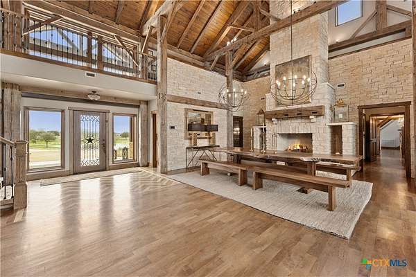 - Beamed Ceilings, Bookcases, Built In Features, Ceiling Fans, Chandelier, Dining Area, Double Vanity, Entrance Foyer, Garden Tub Roman Tub, High Ceilings, Main Level Primary, Multiple Closets, Open Floorplan, Primary Downstairs, Separate Formal Dining Room, Sitting Area In Primary, Smart Home, Stone Counters