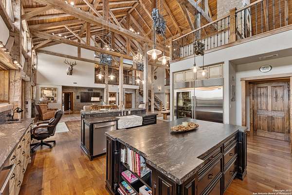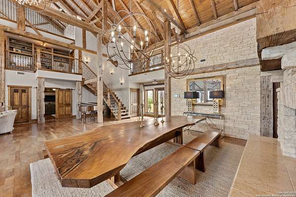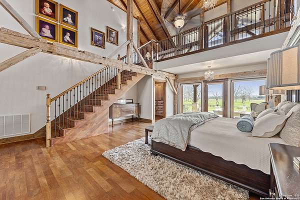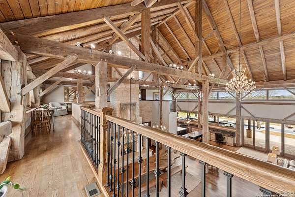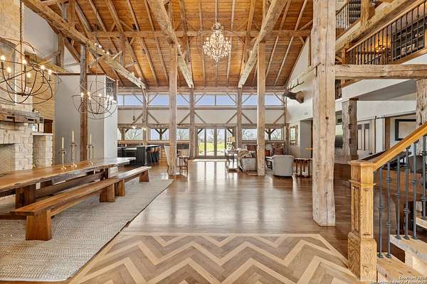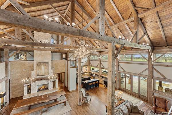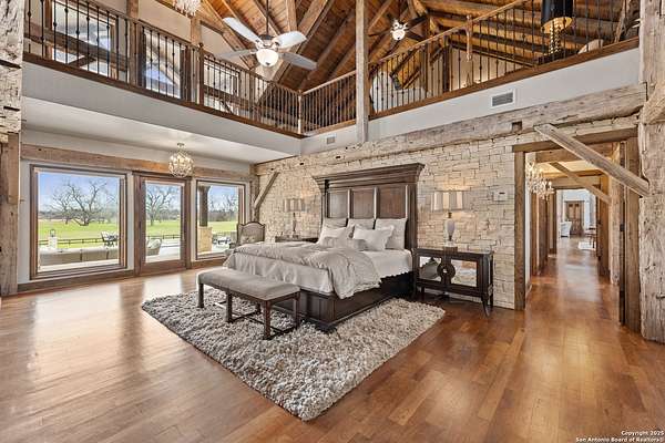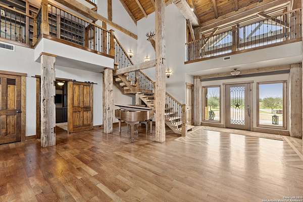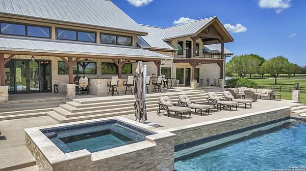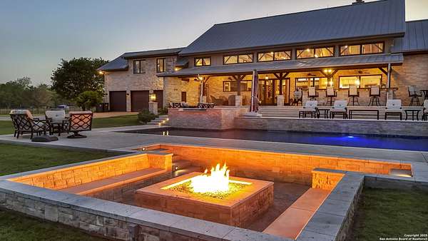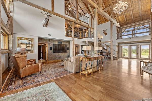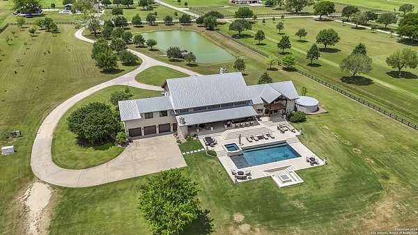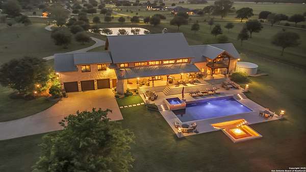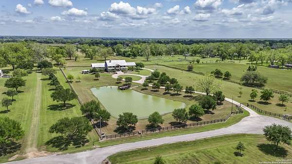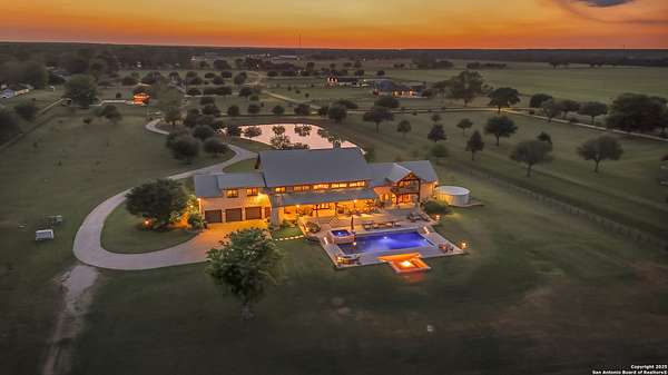 Welcome to 1000 River Trace Dr., a private, gated riverfront estate in the exclusive Providence Landing neighborhood, just one hour west of Houston. This 6,054 sq ft custom home offers 6 bedrooms, 4.5 bathrooms, and extraordinary craftsmanship supported by 200-year-old Hemlock timbers. Nestled on 22.74 acres with 415+ ft of Colorado River frontage and a 4-acre private sandy beach, the property also features a stocked fishing pond with dock, circular drive, and stunning curb appeal. Inside, enjoy soaring ceilings, mesquite and hickory hardwood floors, natural stone fireplace, and high-end finishes throughout. The gourmet kitchen boasts dual islands, two sinks, Sub-Zero fridge/freezer, Wolf range with grill, griddle, and double ovens, plus two dishwashers-perfect for entertaining. Just off the main living area, a hidden sunken wine cellar adds a touch of elegance and function. Step outside to a resort-style oasis with sparkling pool, spa, sunken fire pit, and a fully equipped outdoor kitchen with pizza oven, grill, smoker, ice maker, and dishwasher. The primary suite is a luxurious retreat featuring a private loft, two-story custom closet, exterior pool access, a sunken acoustic tub, and a digitally controlled shower with 17 heads and built-in speakers. Additional amenities include a whole-house generator, 20,000-gallon rainwater collection with UV filter, 3-car insulated garage with EV charger, smart home features, central vacuum, and a rare climate-controlled basement housing all mechanical systems. Ag-exempt with bee hives conveying. This is a one-of-a-kind Texas estate blending modern luxury, timeless materials, and unmatched natural beauty.