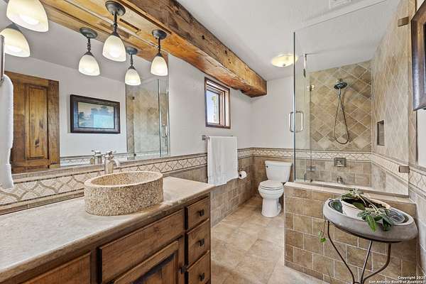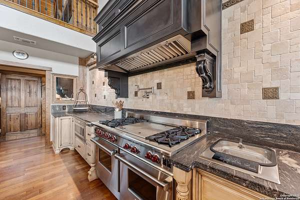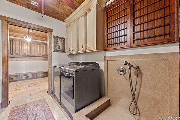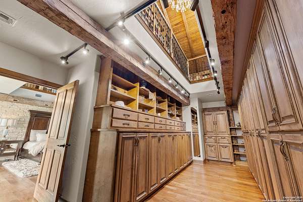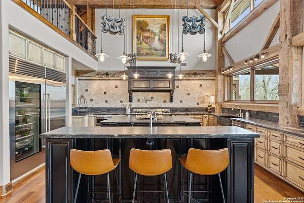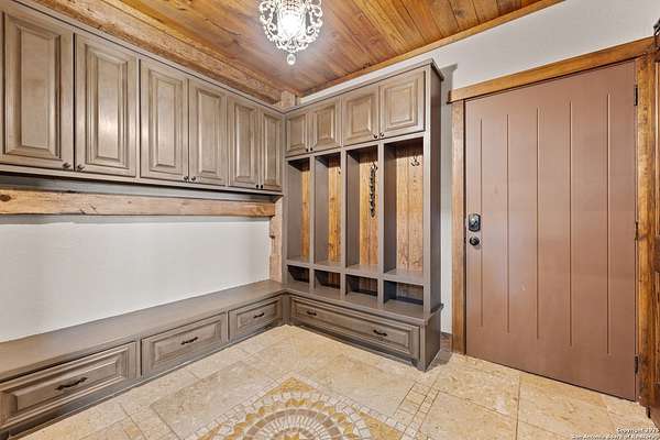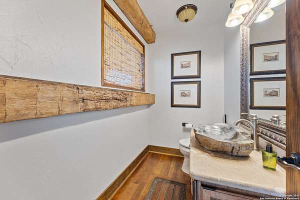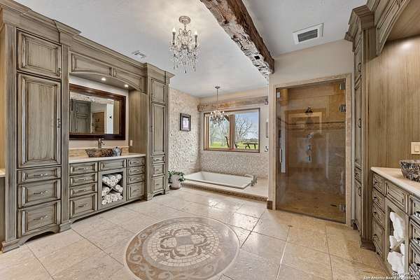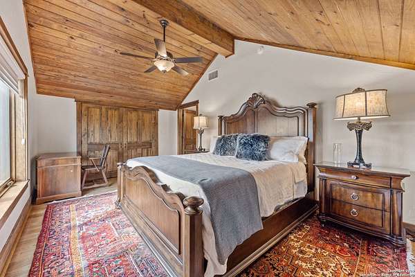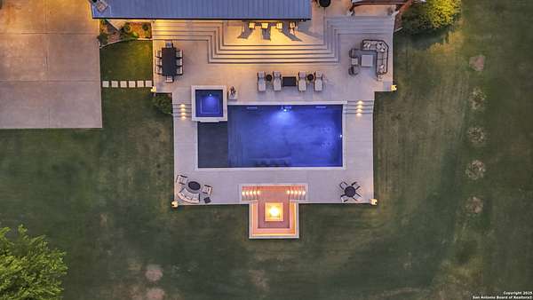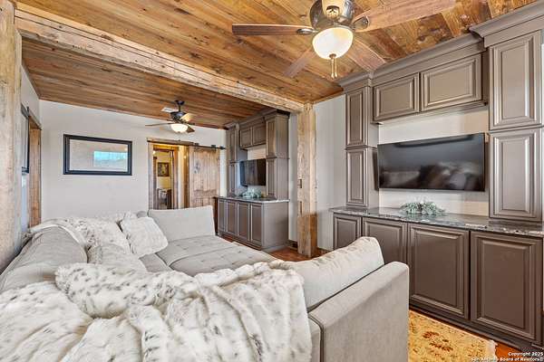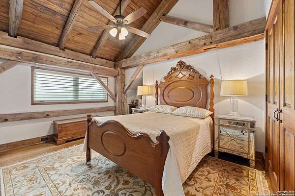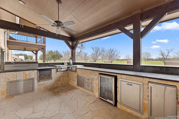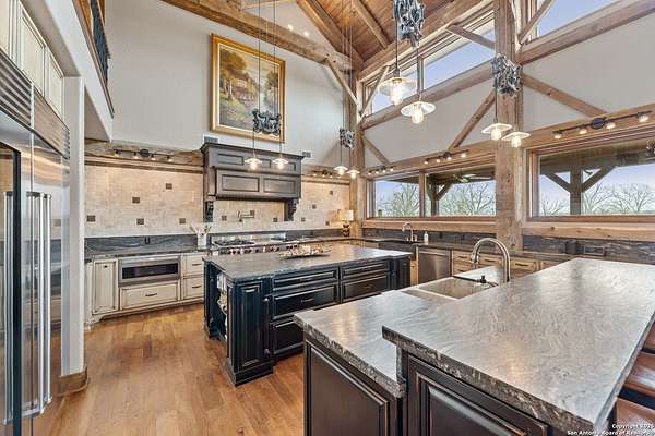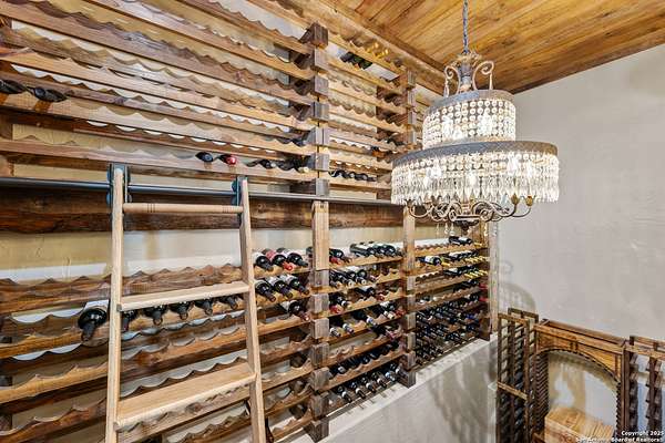 Welcome to 1000 River Trace Dr., a private, gated riverfront estate in the exclusive Providence Landing neighborhood, just one hour west of Houston. This 6,054 sq ft custom home offers 6 bedrooms, 4.5 bathrooms, and extraordinary craftsmanship supported by 200-year-old Hemlock timbers. Nestled on 22.74 acres with 415+ ft of Colorado River frontage and a 4-acre private sandy beach, the property also features a stocked fishing pond with dock, circular drive, and stunning curb appeal. Inside, enjoy soaring ceilings, mesquite and hickory hardwood floors, natural stone fireplace, and high-end finishes throughout. The gourmet kitchen boasts dual islands, two sinks, Sub-Zero fridge/freezer, Wolf range with grill, griddle, and double ovens, plus two dishwashers-perfect for entertaining. Just off the main living area, a hidden sunken wine cellar adds a touch of elegance and function. Step outside to a resort-style oasis with sparkling pool, spa, sunken fire pit, and a fully equipped outdoor kitchen with pizza oven, grill, smoker, ice maker, and dishwasher. The primary suite is a luxurious retreat featuring a private loft, two-story custom closet, exterior pool access, a sunken acoustic tub, and a digitally controlled shower with 17 heads and built-in speakers. Additional amenities include a whole-house generator, 20,000-gallon rainwater collection with UV filter, 3-car insulated garage with EV charger, smart home features, central vacuum, and a rare climate-controlled basement housing all mechanical systems. Ag-exempt with bee hives conveying. This is a one-of-a-kind Texas estate blending modern luxury, timeless materials, and unmatched natural beauty.