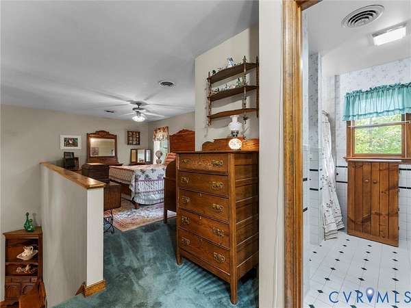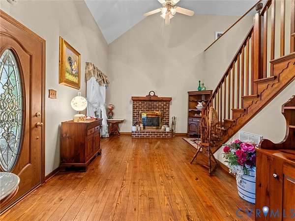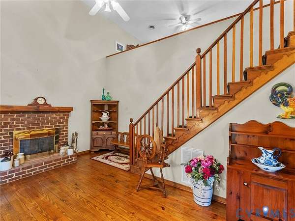 This inviting 3-bedroom, 3-bath home offers 1,710 sq ft of comfortable living space on just over 3 private, wooded acres. With two owner suites-one on the main level and a second expansive suite upstairs-plus a third bedroom, this home provides exceptional flexibility for multi-generational living or guests. The upstairs suite is privately situated in a spacious loft featuring a luxurious full bathroom with a double vanity, tiled shower, and soaking tub. A large walk-in closet, currently used as an office, highlights the versatility of this area. The main-level suite and guest room are complemented by a convenient third full bath, providing comfort and accessibility for all. Enjoy a bright, functional kitchen with abundant cabinet space, pantry storage, and both kitchen and dining areas for flexible meals. The cozy gas-burning fireplace with its brick surround and wooden hearth creates the perfect spot to unwind. Beautiful hardwood floors flow throughout, adding warmth and character. Outdoor living shines with a welcoming front-country porch and a rear deck overlooking your peaceful wooded retreat. Additional features include a carport, two storage sheds, and a washer and dryer that convey. Perfectly located near the Amelia Wildlife Management Area, this home offers the ideal blend of country charm and modern convenience, just a short drive to shopping and schools.