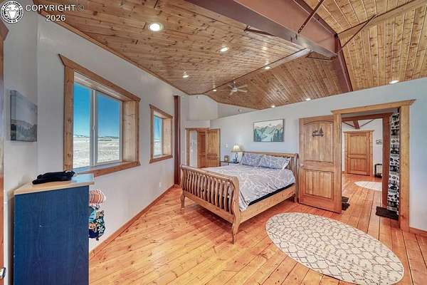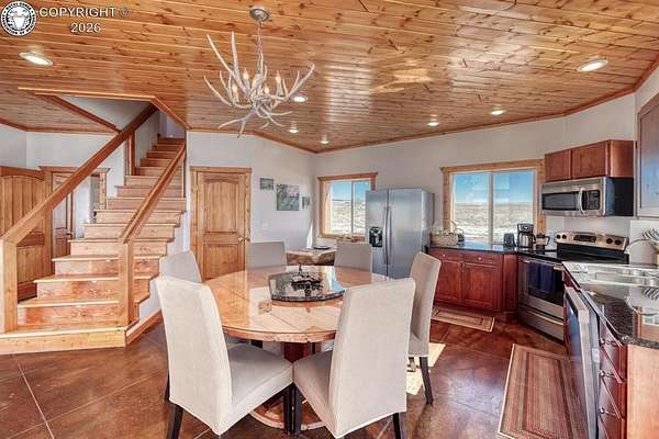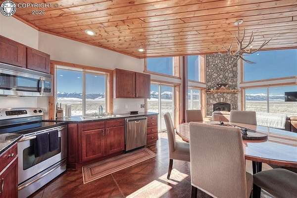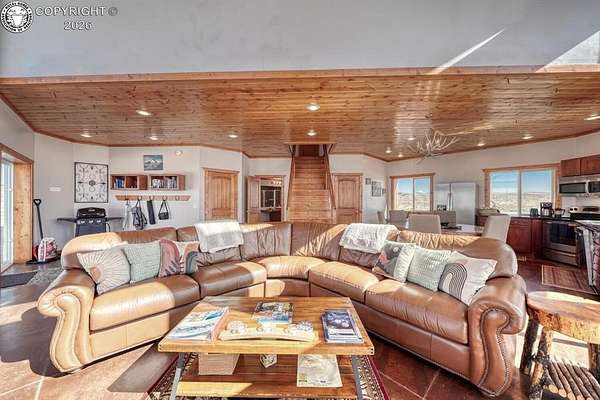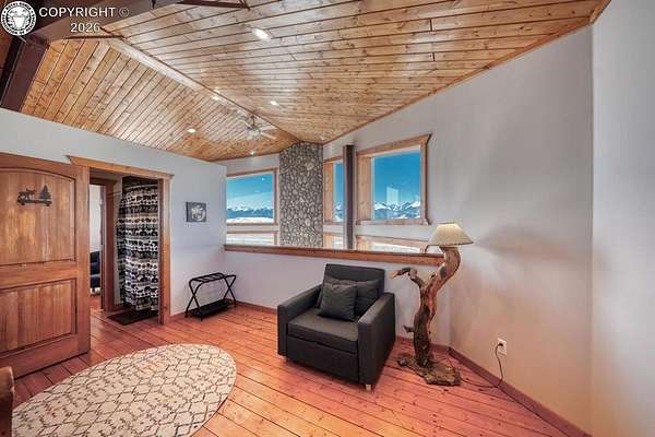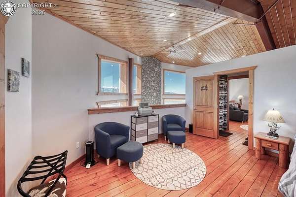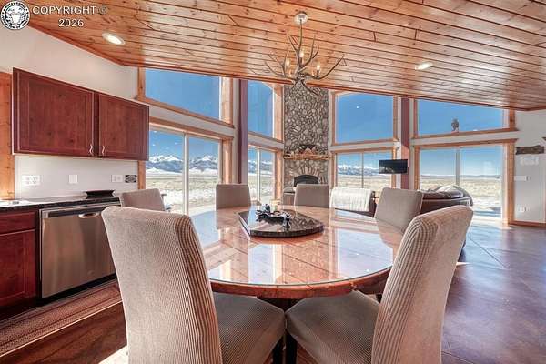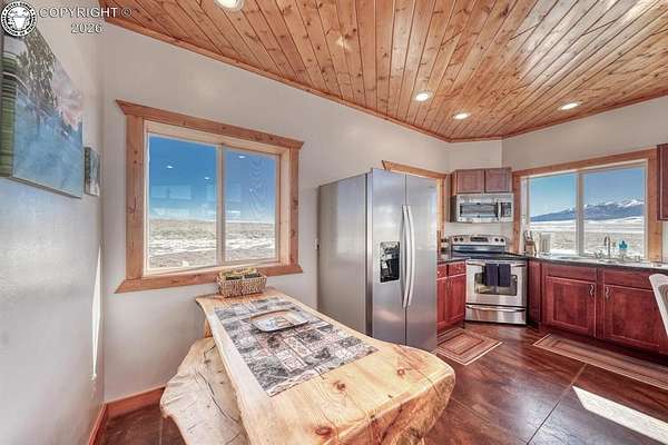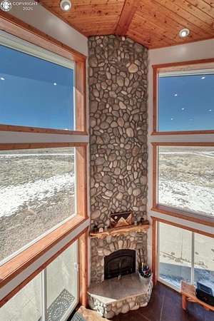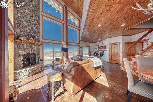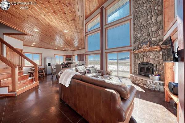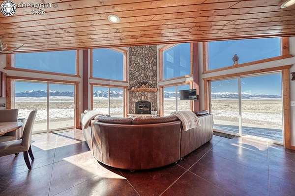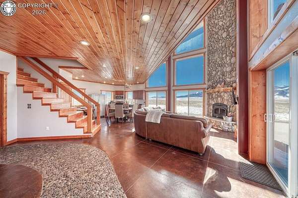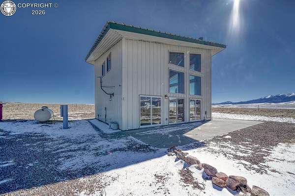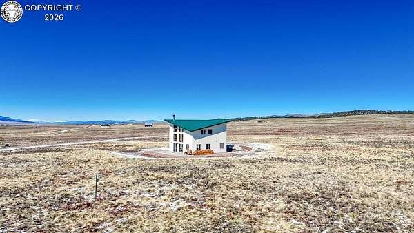 This property offers breathtaking, 360-degree views of the Sangre de Cristo Mountains and the surrounding landscape. The home is thoughtfully designed to bring this beauty indoors through vaulted ceilings and floor-to-ceiling windows. The Main level features a great room that integrates the kitchen, dining, and living areas, with a 23-foot river rock fireplace. This level also includes a full bathroom with a washer/dryer. The upper floor contains two spacious bedrooms with ample closet space, connected by a Jack and Jill Bathroom. This 5 plus acre lot allows for horses, with ample room to build your shop or garage. The property, just minutes from downtown Westcliffe, is part of the International Dark Sky Communities. Nearby outdoor activities are plentiful, including biking, fishing, skiing, and snowshoeing. And if you like hiking, you are just minutes away from the Rainbow Trail, one of Colorado's Longest Hiking Trails. Outside of a few personal items, the house is furnished and ready to move in!
