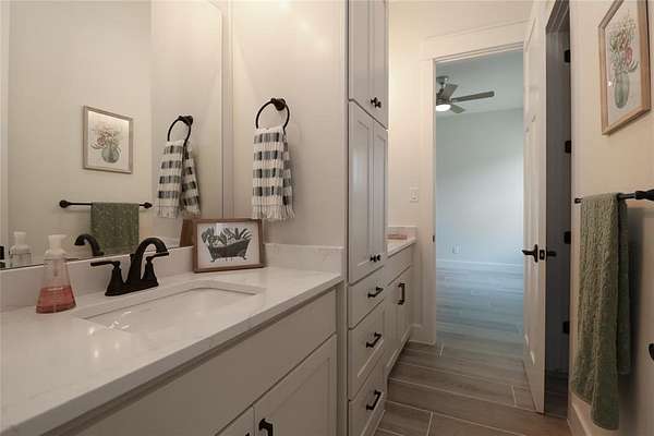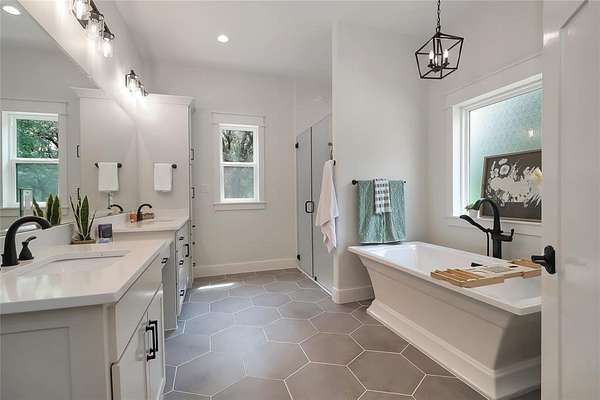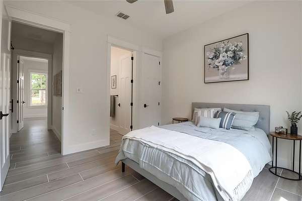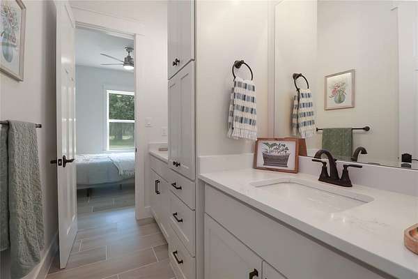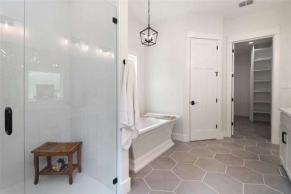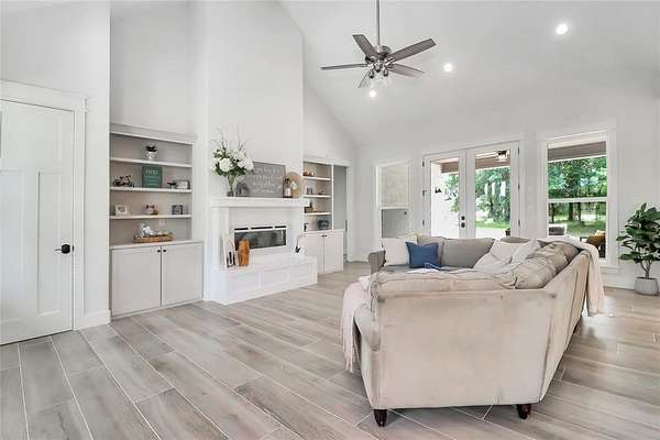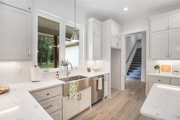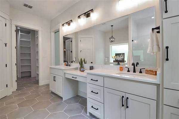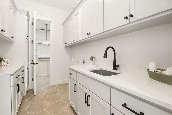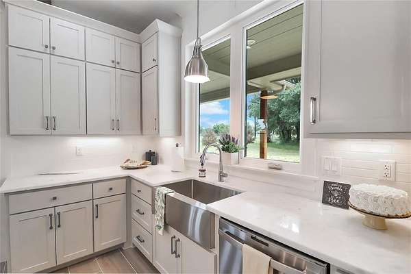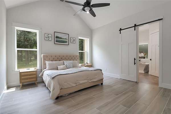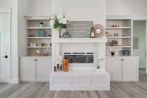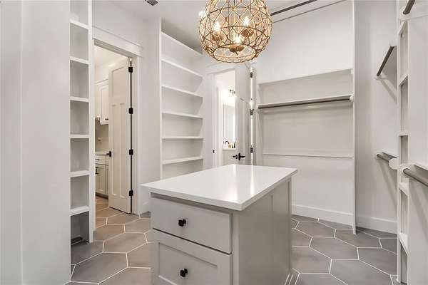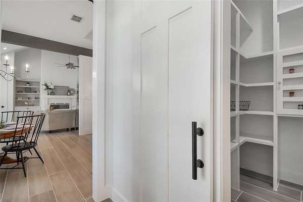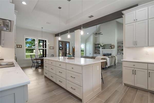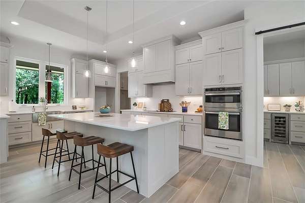 Inside, every detail is intentional. The kitchen features a large island with deep drawers in place of traditional cabinets, a farmhouse sink, and soft-close drawers throughout. A neutral color palette flows seamlessly from room to room, offering a blank canvas to personalize and truly make the space your own. Storage is plentiful and smartly designed, with custom closet systems that maximize space in every room and a hidden secret room perfect for a gun safe, panic room, or additional storage.