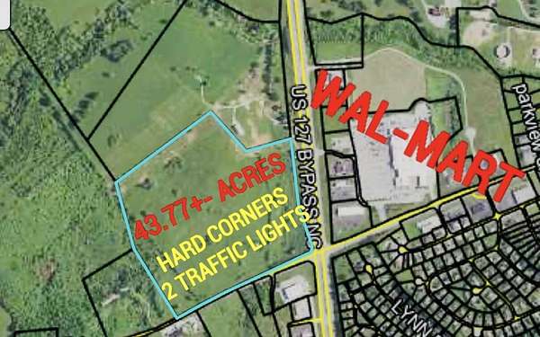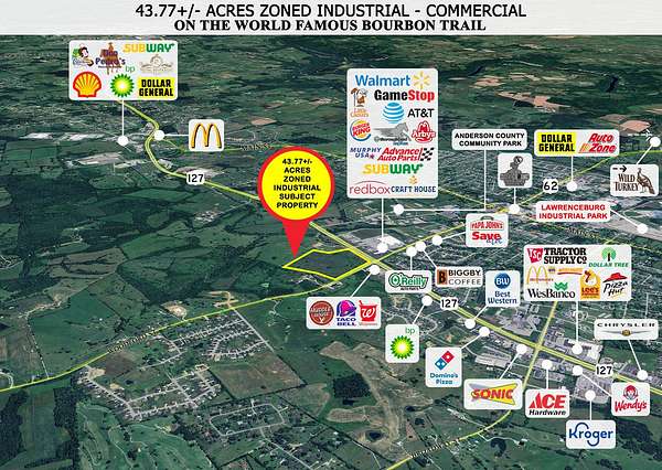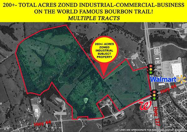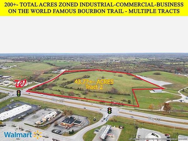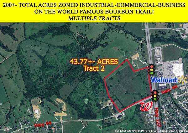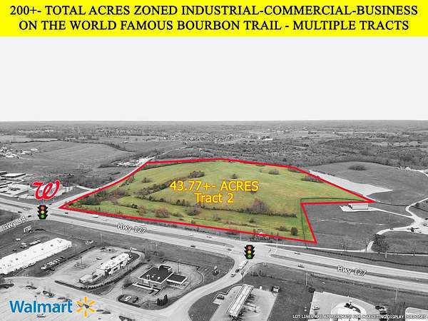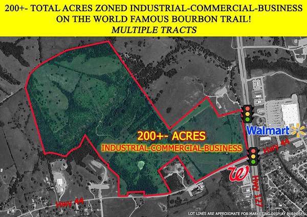 HARD CORNERS @ MULTIPLE TRAFFIC LIGHTS AND DIRECTLY ACROSS FROM WAL-MART, WAL-GREENS, AND MANY MORE-TALK ABOUT LOCATION, LOCATION, LOCATION!!! This exceptionally located property sits at the intersection of HWY 127/HWY 44 and directly on the World Famous Bourbon Trail. There is currently direct access from the Wal-mart intersection into the property and additional entrances are possible. Property contains a total of up to 200+- acres and is zoned for Industrial-Business-Commercial mixed uses. Property lends itself well for approximate 50 front acres to be utilized for commercial (Restaurants? Hotels? Retail? Brewery? Service Stations?) and approximate 150 acre rear portion to be utilizes for industrial (Bourbon Warehousing? Manufacturing plants? Distilleries? Industrial Factories?) Huge natural gas, electric, public water, public sewer, multiple manholes all available at the property. Seller may consider selling in 20 acre tracts minimum on certain portions of the property. Call today to schedule your showing! Please note; This ad is for the 43.44 acre portion of the property that sits directly against HWY 127/HWY 151. Listing Broker relative to seller.