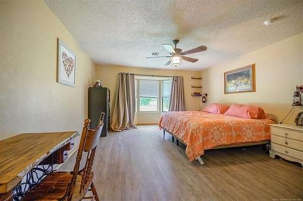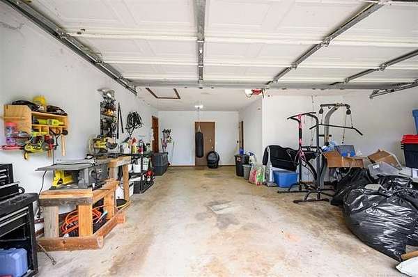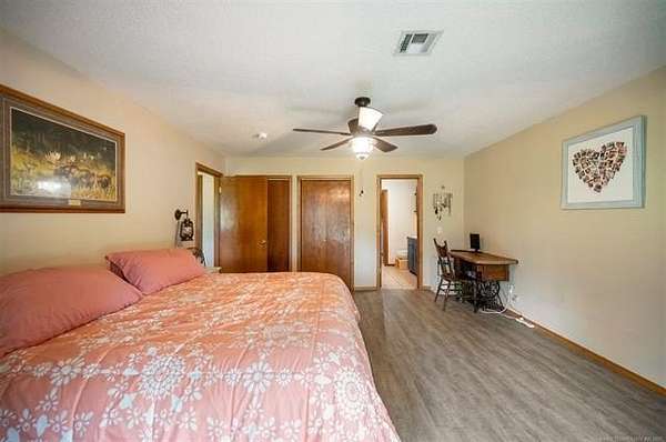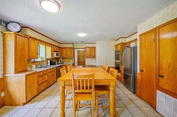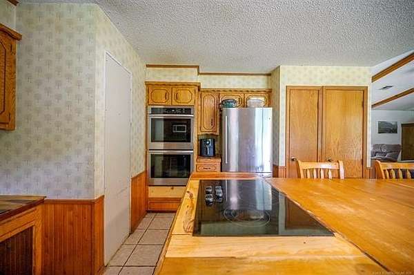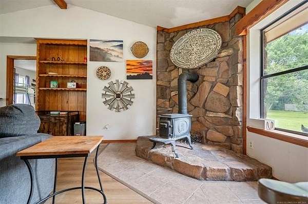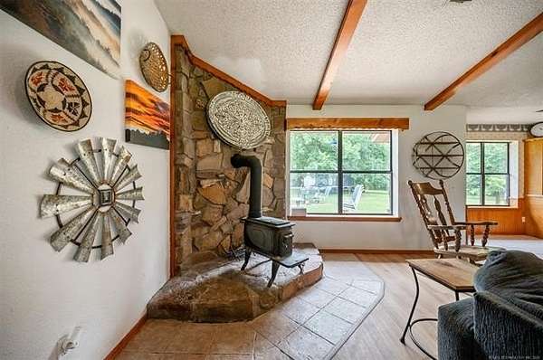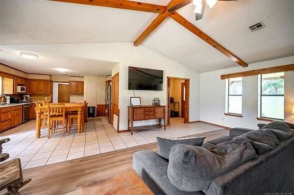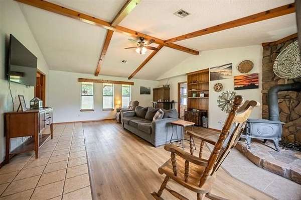 Must see to appreciate terrific place in a beautiful location that can't be beat! Approximately 2,068 square feet (per Choctaw County tax assessor) home offering a light and bright living area with vaulted ceiling with stained accent beams, a wood-burning stove with native stone surround, and trendy dual-type flooring. Full view of the dining area and kitchen with abundant cabinets and counter space. Owner's suite features a large bedroom with a private bathroom with many updates, including a tiled shower, and there is direct, convenient access to the laundry room. There is an additional large guest bedroom and full bathroom plus one will love the little hobby room accessed from inside the home's two-car garage. Outdoors, not only can you enjoy ten acres of mostly beautifully wooded property full of wildlife, the open area around the home is where you can enjoy a workshop that has electric, a roll up door, pedestrian entry door and attached open front equipment shed, a weatherproof storage shed on slab with power, an older barn with abundant storage space, a chicken coop, raised garden beds, peach trees, and a pear tree, plus abundant yard space for kids or pets to play. Call today for a personal property tour.
