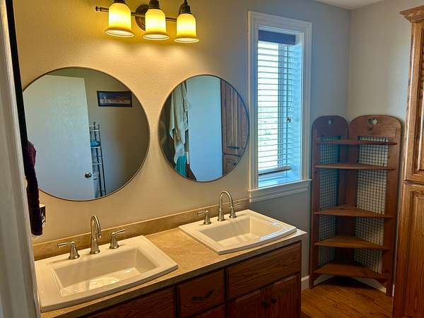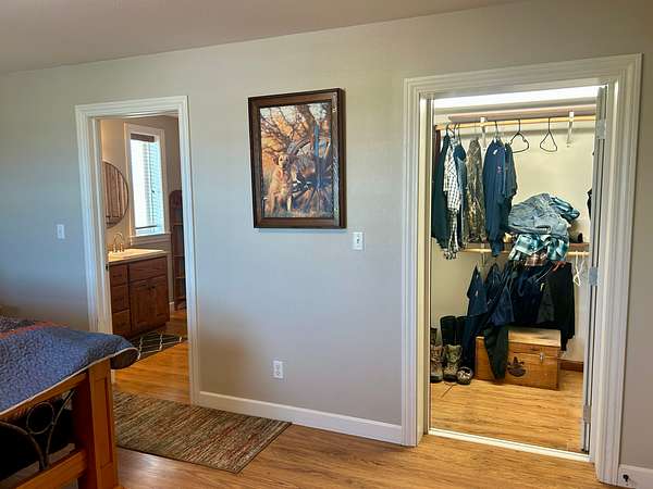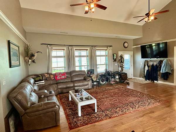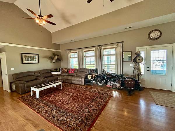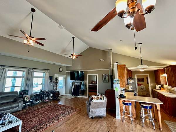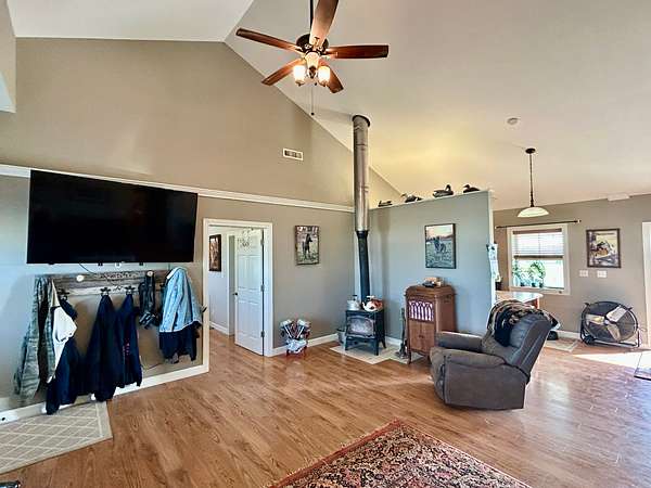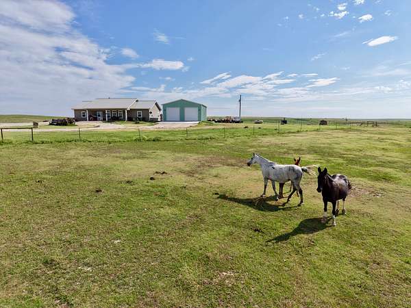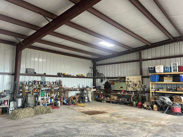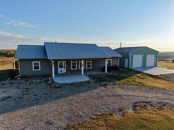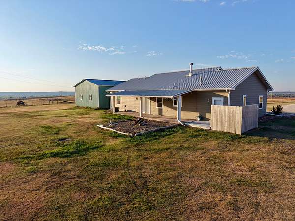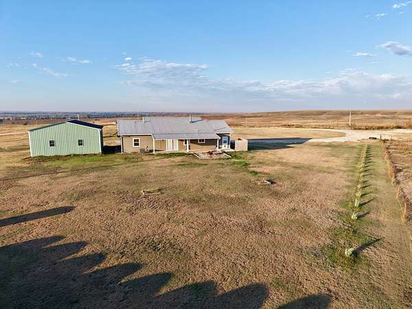 Built in 2011, this Ranch style home has around 1800 square feet of finished living space. The home has a steel frame with a metal roof and concrete siding. It is highlighted by an open concept main room that has 18 foot vaulted ceilings and large windows that allow plenty of natural light. The home has 3 bedrooms and 2 bathrooms including the master suite. The master closet also serves as a concrete storm shelter. The home is on a water well, septic system and propane. There is also a reverse osmosis system. Enjoy the peace and quiet this property has to offer on either one of the two covered porches on the house.