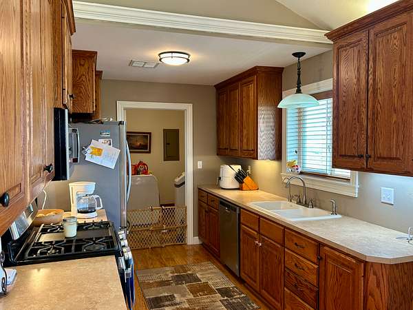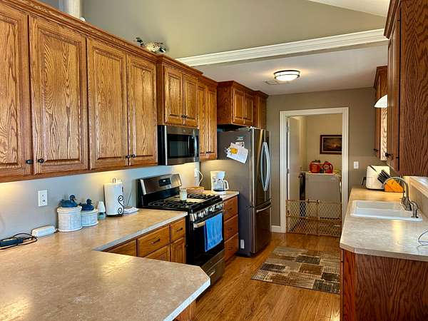 This country property features a beautiful, move-in ready home, detached garage and a large shop located northwest of Hays, Kansas.