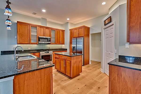 The heart of the home is the open-concept kitchen, showcasing granite countertops, under-cabinet lighting, and brand-new appliances, including a new oven, wine cooler, and refrigerator. The kitchen flows seamlessly into the living and dining areas, all enhanced with new LED recessed lighting, new ceiling fans in every room, and new blinds throughout--creating a bright, cohesive, and move-in-ready living space.
