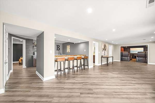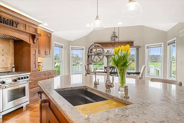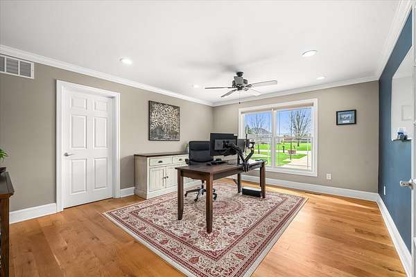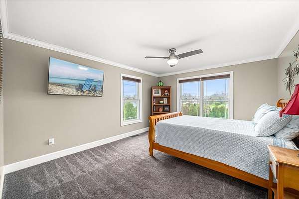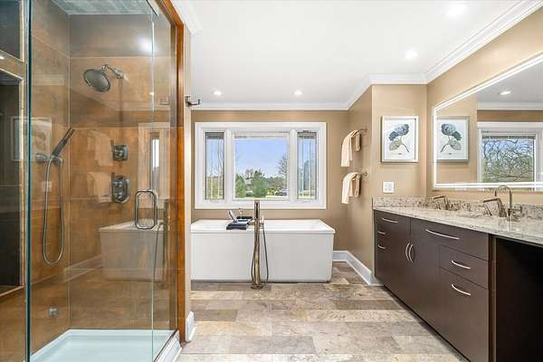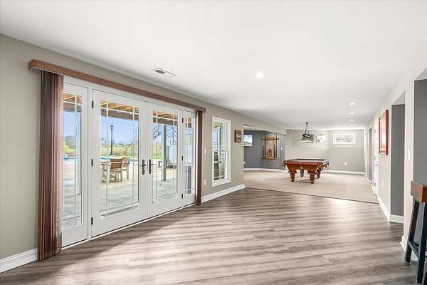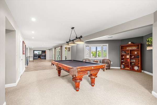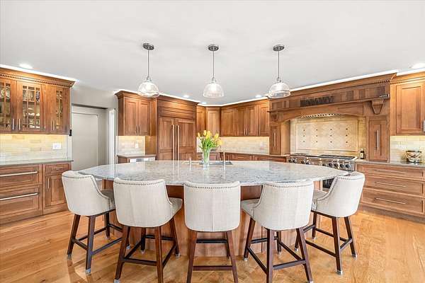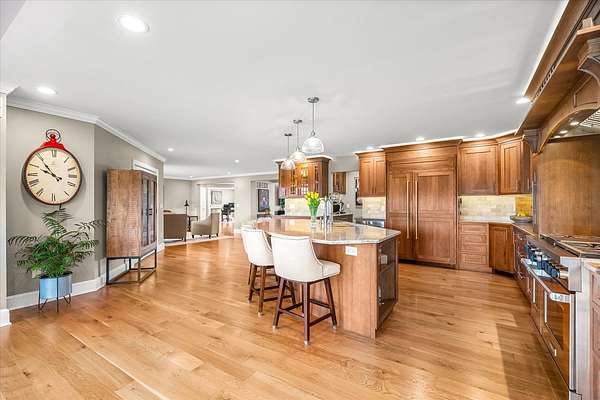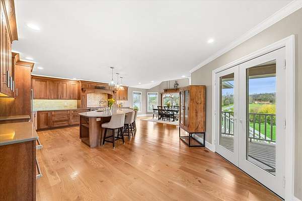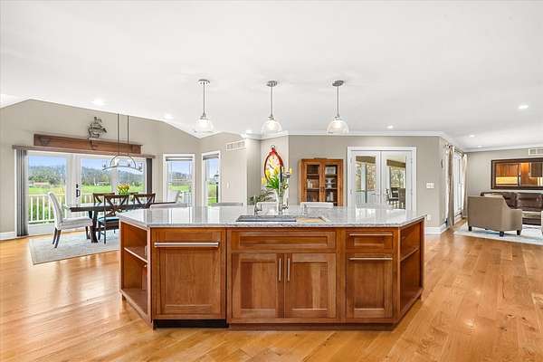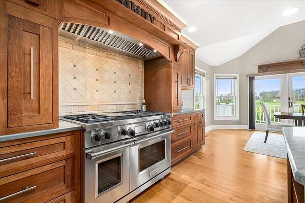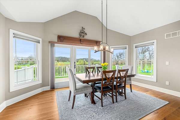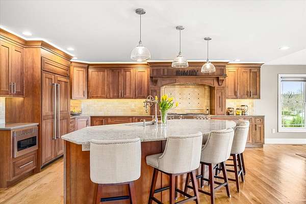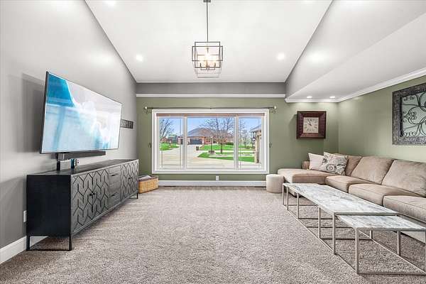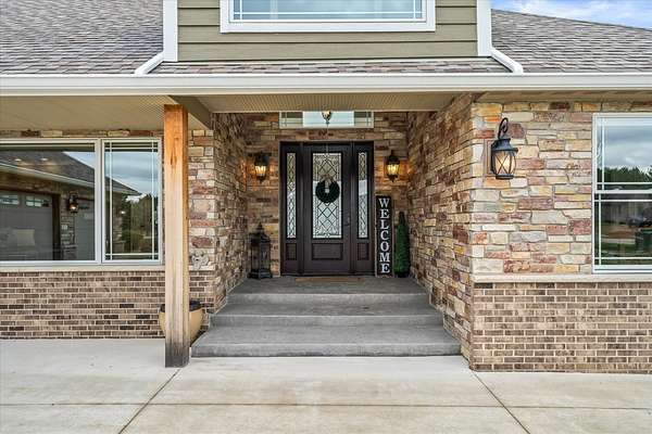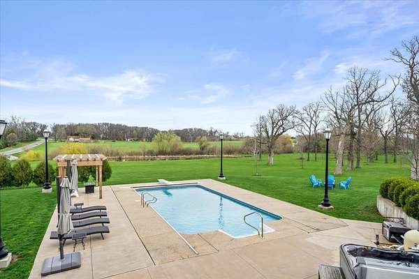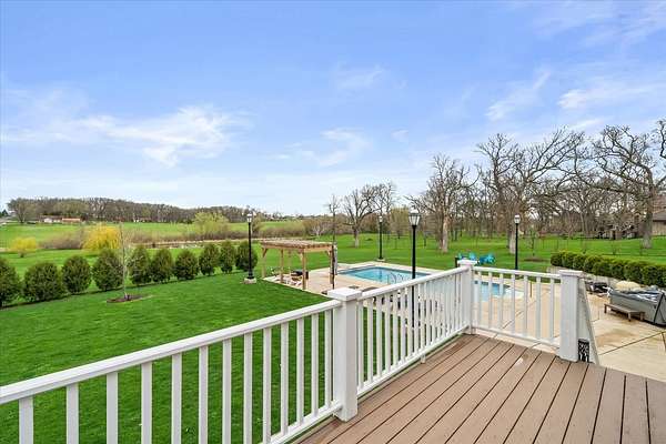 Welcome to a home that truly delivers everyday luxury-where thoughtful design, high-end finishes, and a private setting come together to elevate how you live every single day. Set on over 2 acres, this 5,800+ sq ft sprawling ranch lives like your own private resort. From the moment you arrive, the brick, stone, and Hardie plank exterior paired with Pella Prairie-style windows set the tone for what's inside-quality, comfort, and attention to detail throughout. Inside, the home opens up exactly how you want it to-wide, flowing spaces, quarter-sawn white oak floors, and oversized trim, crown molding, and solid doors that give the home a substantial, finished feel. The open living, dining, and kitchen layout was designed for real life-easy to live in and even better when the house is full. The main level greets you with a large foyer leading to a private office behind French doors (or 5th bedroom), an inviting living room, a spacious family room for gatherings, and a primary suite that feels like a true retreat. Step out to your deck overlooking the pool and private stocked pond, or unwind in the steam spa bath with soaking tub and full body spray shower. It's the kind of space you'll use-and appreciate-every day. The kitchen anchors it all. High end appliances such as Wolf range, paneled Sub-Zero refrigeration, quartz countertops, and an oversized island with seating for six. Custom maple cabinetry with thoughtful storage, pull-outs, and lighting throughout. Add in the walk-in pantry and butler's pantry/coffee station, and you've got a space that works as well as it looks. The finished walk-out lower level turns this home into an entertainer's dream. A full recreation area, expansive wet bar with live-edge wood top, refrigerated drawers, and wine and beverage refrigeration. Additional spaces include an exercise/flex room, an additional bedroom, and a fully equipped home theater-creating the perfect setup for hosting or simply enjoying a night in. Two large storage rooms offer the opportunity to expand the finished space even further. Outside is where this home really separates itself. Multiple outdoor living areas, cedar decks, and a 35x45 aggregate patio lead to a heated Olympic-sized inground pool, hot tub, and pergola. Enjoy wide-open views and breathtaking sunsets. Whether it's a quiet morning, a full house, or an evening by the water, this property delivers a true staycation lifestyle-every day of the week. Add in a heated 3-car garage, a concrete drive with ample parking, and a setting that offers both privacy and space-and you have a home that checks every box. This isn't just a home-it's a place where life feels better, easier, and a little more enjoyable every day.