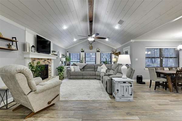 Nestled on just under 9 acres, this Alvarado gem is a nature lover's dream with a perfect blend of heavily wooded, forest-like areas and open, park-like clearings. The gated entry with keypad and remote welcomes you to a beautifully maintained property designed for comfort, functionality, and year-round enjoyment. The wide-open floorplan features 4 spacious bedrooms, 2 full baths, vaulted ceilings, and wood-look tile throughout. The kitchen is the heart of the home with a massive island, black stainless appliances, and plenty of room to gather. Step into the private owner's retreat or relax by the cozy gas fireplace in the living room. Outdoor amenities abound with a covered back patio, gas firepit, built-in grill, and serene views of hundreds of mature trees--truly a birder's paradise. The concrete circle drive adds convenience and curb appeal, while a separate drive leads to the Texas-sized shop featuring water, a half bath, oversized utility sink, large overhang, RV and or boat parking, and an additional Conex storage building. Need extra space? Enjoy a charming she shed with power and heat and air--perfect for a gym, art studio, or home office. Other highlights include a spray foam insulated attic, cedar-lined garage, crown molding, 2 inch blinds throughout, ceiling fans in every room, walk-in closets, and a newly installed drainage system directing water to the front of the property and down to the creek.This property offers space, privacy, and the ultimate setting for entertaining or unwinding--inside and out. You'll feel like you're living in your own private park!