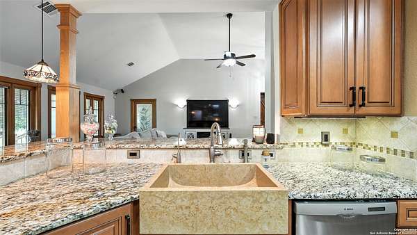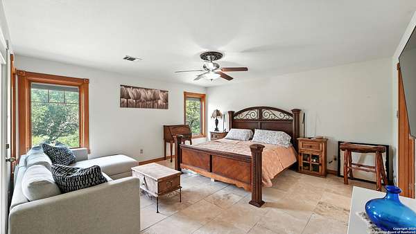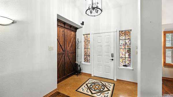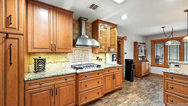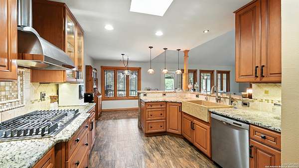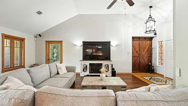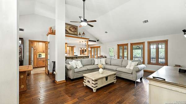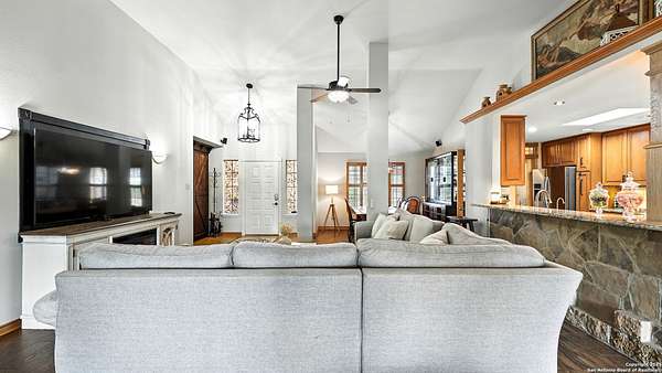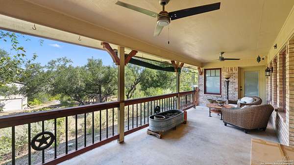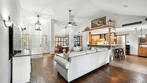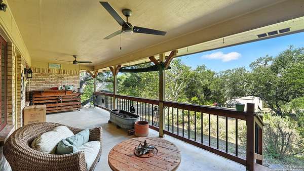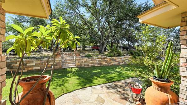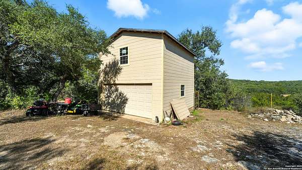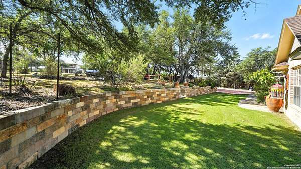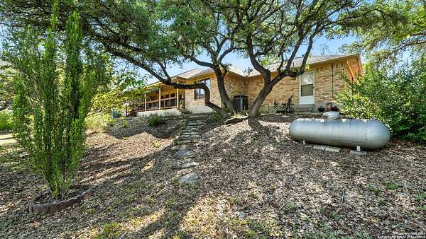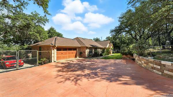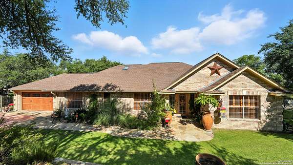 Welcome to your dream home! A stunning country-style Tilson residence that perfectly combines rustic charm with modern convenience. Nestled on 2.18 acres of picturesque land, this property offers a breathtaking country view and endless opportunities for relaxation and entertainment. The ceramic tile entryway invites you in, while the high ceilings and open space concept create an airy and welcoming atmosphere. Enjoy the blend of hickory wood, stone and ceramic flooring adding a touch of natural beauty to each room. The pantry and kitchen feature custom Cordell cabinets that provide ample storage space, beautiful granite countertops and sink, elegant Tiffany-Style chandeliers and skylights illuminate the space. Home includes Pella TRIPLE pane windows, complete with built-in screens and blinds. A beautiful retaining wall out front enhances the curb appeal, while a flagstone sidewalk guides you to the entrance. Enjoy the convenience of a 1-acre fully fenced-in area, complete with a heavy-duty custom front fence and two large entry gates for added security and privacy. For those with an RV, the electrical and waste hookup is a valuable addition, making travel preparations a breeze. The property also boasts a two-story garage/workshop. Located on a quiet cul-de-sac, this home is just a 25-minute drive from San Antonio, New Braunfels, or Canyon Lake, providing easy access to city amenities while maintaining a peaceful, country lifestyle. Enjoy the convenience of being minutes away from The District on 46, offering local shopping and dining options. This country retreat embodies the perfect blend of rustic charm and modern amenities.