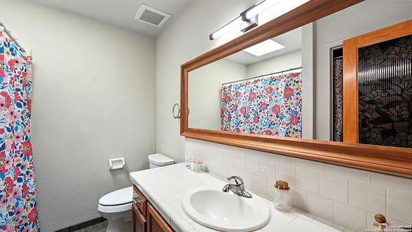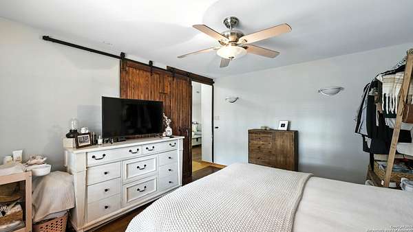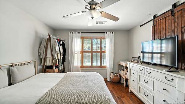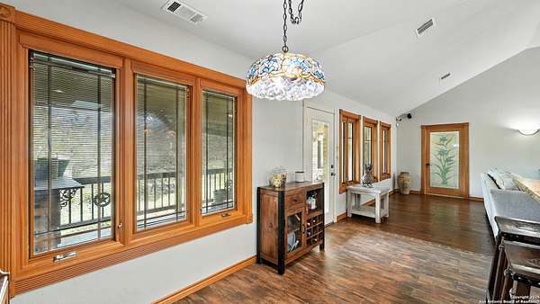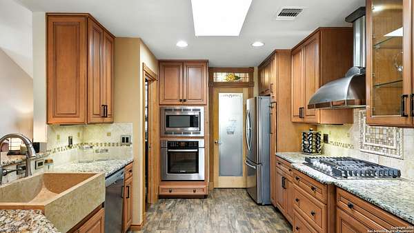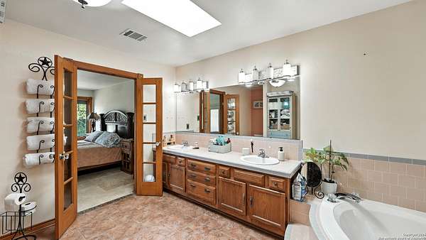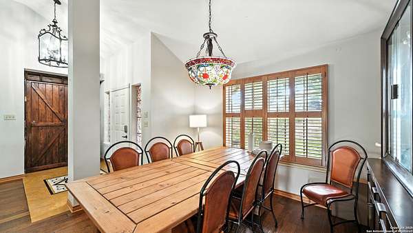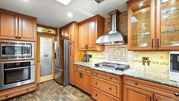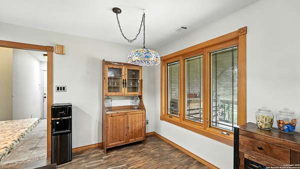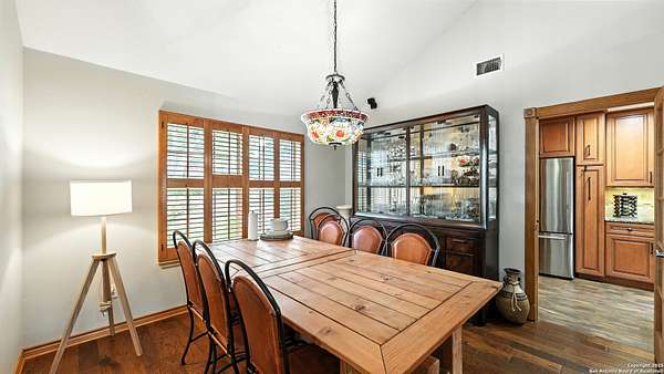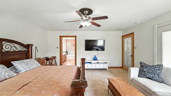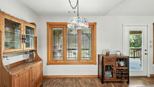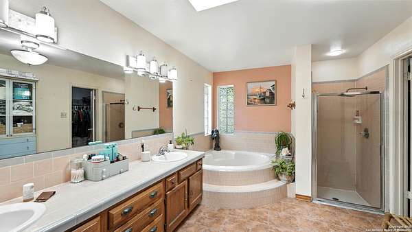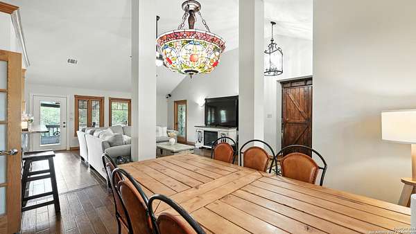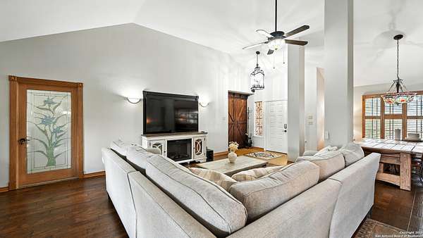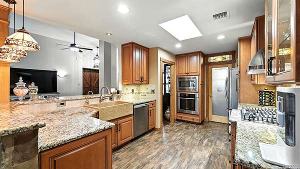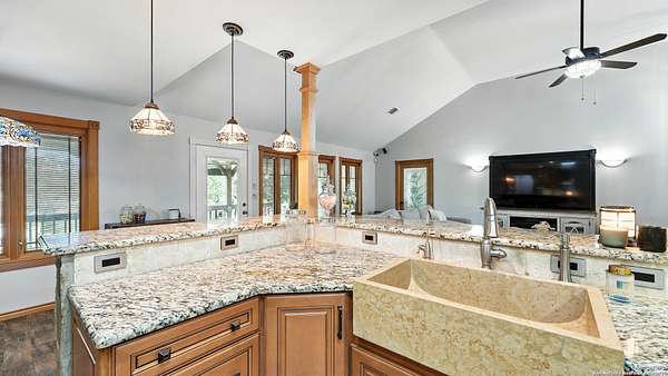 Welcome to your dream home! A stunning country-style Tilson residence that perfectly combines rustic charm with modern convenience. Nestled on 2.18 acres of picturesque land, this property offers a breathtaking country view and endless opportunities for relaxation and entertainment. The ceramic tile entryway invites you in, while the high ceilings and open space concept create an airy and welcoming atmosphere. Enjoy the blend of hickory wood, stone and ceramic flooring adding a touch of natural beauty to each room. The pantry and kitchen feature custom Cordell cabinets that provide ample storage space, beautiful granite countertops and sink, elegant Tiffany-Style chandeliers and skylights illuminate the space. Home includes Pella TRIPLE pane windows, complete with built-in screens and blinds. A beautiful retaining wall out front enhances the curb appeal, while a flagstone sidewalk guides you to the entrance. Enjoy the convenience of a 1-acre fully fenced-in area, complete with a heavy-duty custom front fence and two large entry gates for added security and privacy. For those with an RV, the electrical and waste hookup is a valuable addition, making travel preparations a breeze. The property also boasts a two-story garage/workshop. Located on a quiet cul-de-sac, this home is just a 25-minute drive from San Antonio, New Braunfels, or Canyon Lake, providing easy access to city amenities while maintaining a peaceful, country lifestyle. Enjoy the convenience of being minutes away from The District on 46, offering local shopping and dining options. This country retreat embodies the perfect blend of rustic charm and modern amenities.