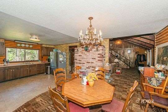 Tucked away at the end of a private road and bordered by Forest Service land, this rustic 1,808 sq ft log home offers peace, privacy, and natural beauty on 9.22 acres. Built in 1978 from durable Eastern Yellow Pine, the home features classic craftsmanship and warm woodwork throughout.The spacious main-level primary bedroom includes a beautifully tiled shower in the en-suite bath. Upstairs, you'll find a comfortable guest bedroom and a full guest bathroom-perfect for visitors or family. A floor-to-ceiling stone hearth with a wood stove insert anchors the living space, creating a cozy atmosphere. Natural light pours in through a thoughtfully placed solar tube. Flooring includes carpet throughout, with vinyl in the kitchen.This sanctuary features-two year-round creeks flow through the property and serve as the home's water source. Enjoy the added charm of a seasonal pond, ideal for watching local wildlife or simply soaking in the quiet. Additional features include a detached two-car garage, a separate workshop, and total seclusion with no nearby neighbors. Whether you're looking for a retreat, a basecamp for adventure, or a peaceful full time residence.