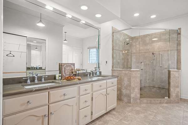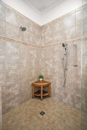 The luxurious primary suite on the main level is a true retreat, complete with heated floors, dual vanities, a large tile shower, walk-in closet, and a linen closet with washer/dryer hookups for added convenience. Additional rooms on this level provide flexibility for a home office, study, or guest room.
