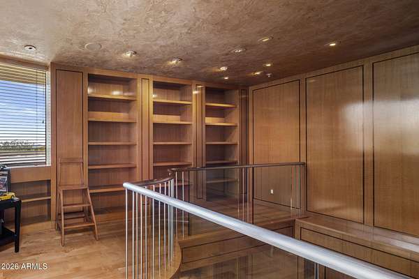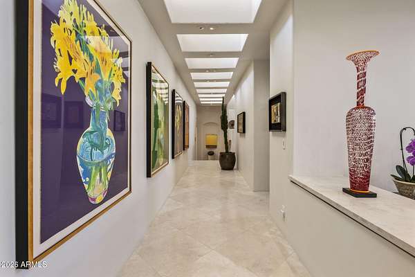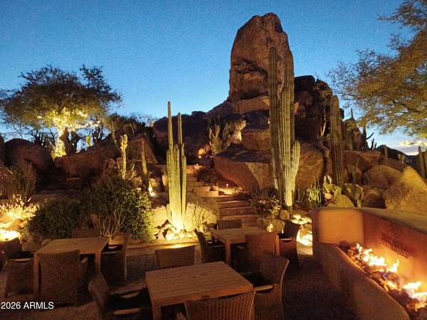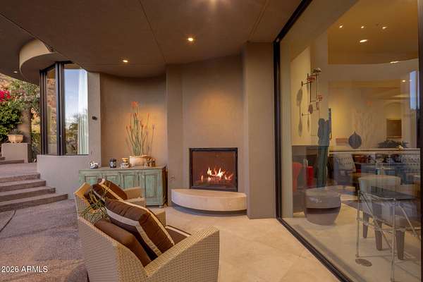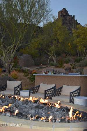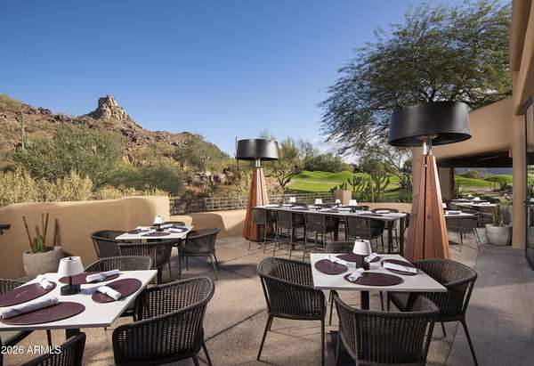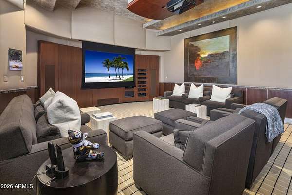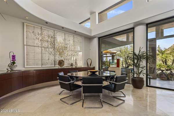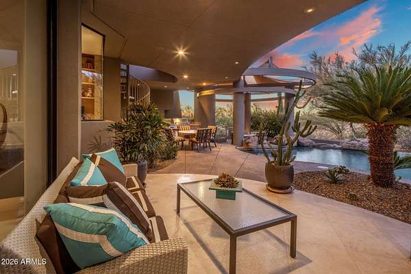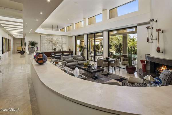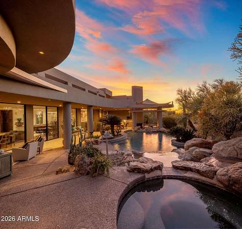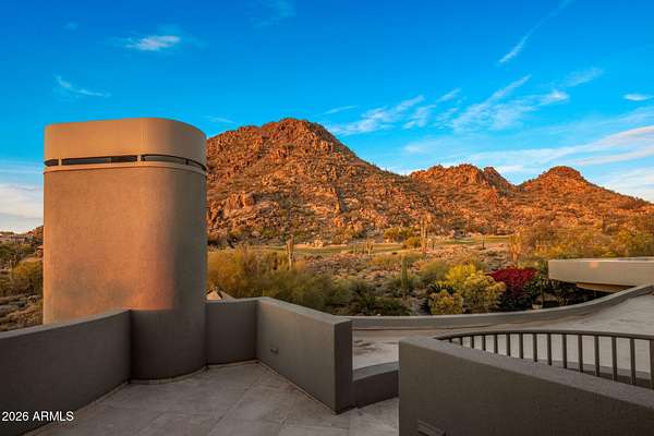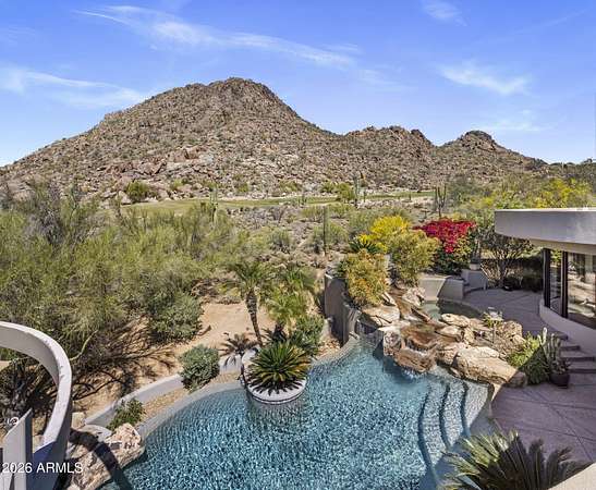 Designed by renowned architect Vernon D. Swaback, apprentice to Frank Lloyd Wright, this 6,700 sq ft contemporary estate on the premier street in Desert Highlands blends timeless architecture with comfortable desert living. Set on 1.8 acres overlooking the 1st hole of the Jack Nicklaus Signature Course and Pinnacle Peak, the home was thoughtfully positioned to capture golf course and mountain/boulder outcrop views from all main living spaces. The 2,000+ sq ft great room features soaring ceilings and walls of glass that open to the backyard, creating an easy indoor outdoor flow that feels natural and inviting. Distinctive spaces include a dramatic two story library, a private movie theatre with wet bar, and a temperature controlled 4 car garage. The main level primary suite offers two spacious closets and direct access to the heated spa, giving it a true retreat feel. Two additional guest suites provide privacy, including one with its own rooftop deck and spiral staircase to the patio. Even four-legged family members are pampered with a dedicated fenced run and doggie door. The backyard is designed for everyday enjoyment and entertaining, with a heated negative edge pool and spa, waterfall, fireplace, built-in BBQ, and multiple seating areas framed by natural boulder outcroppings and desert views. An immediate golf membership is available with access to the full lifestyle at Desert Highlands, including championship golf, tennis, pickleball, a renovated fitness center, clubhouse, and 24 hour guard gated security. The property is walking distance to the 18 hole putting course. If you're looking for a home with thoughtful architecture, seamless indoor outdoor living, and a premier golf course setting in North Scottsdale, this is a rare opportunity.