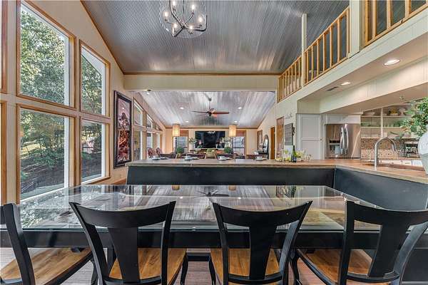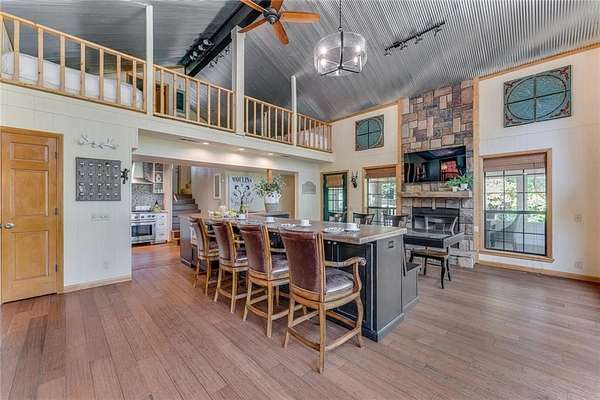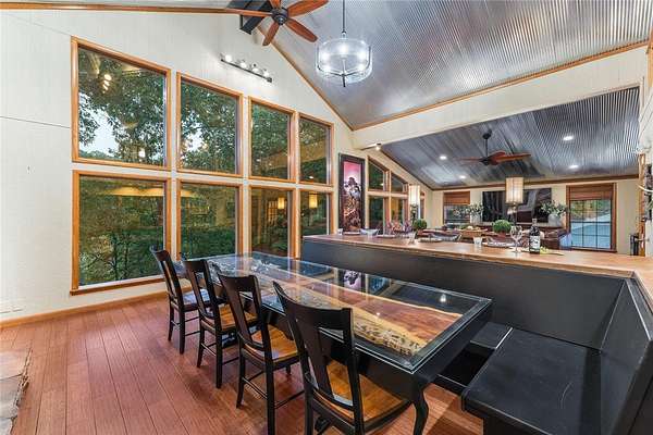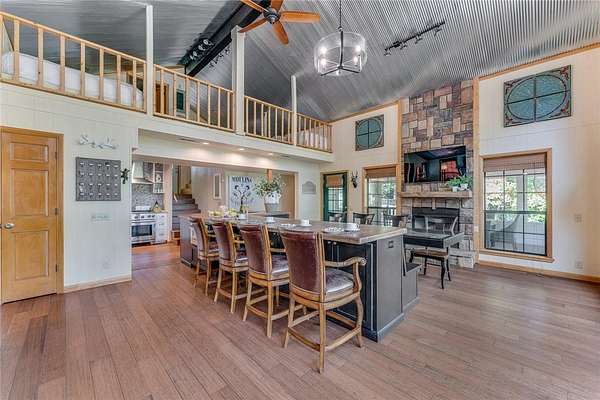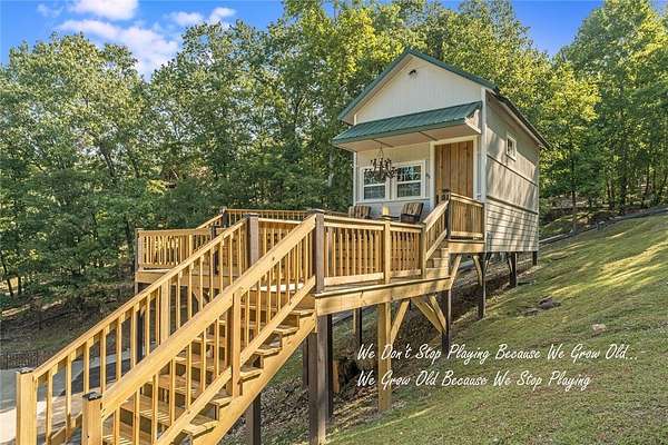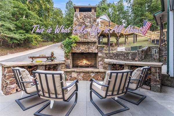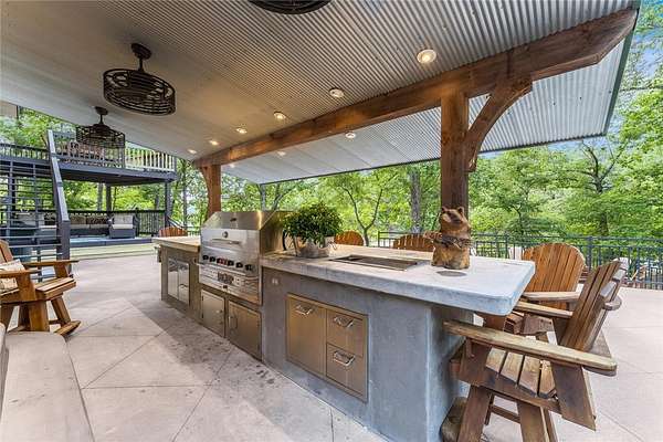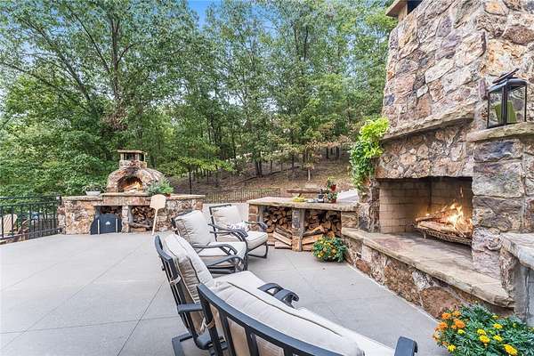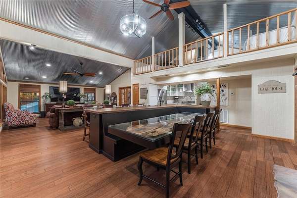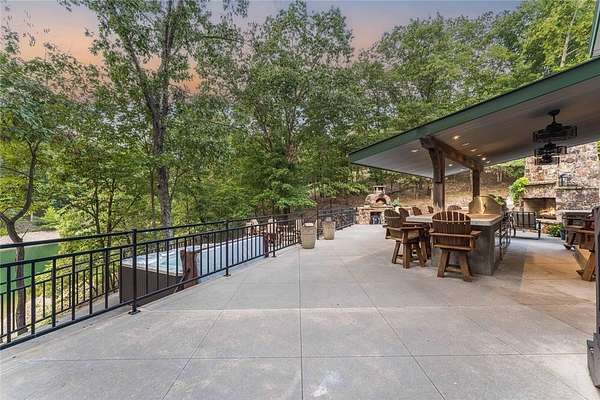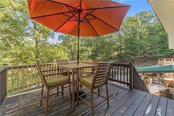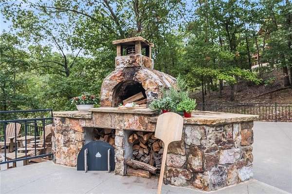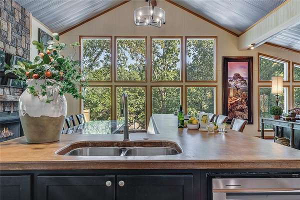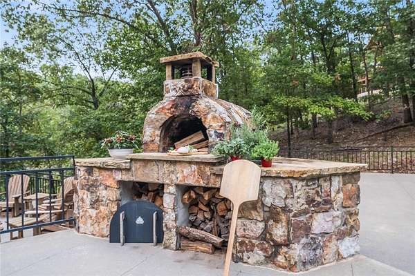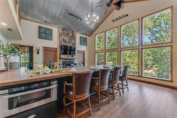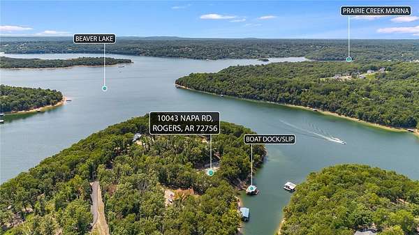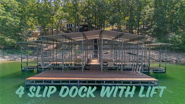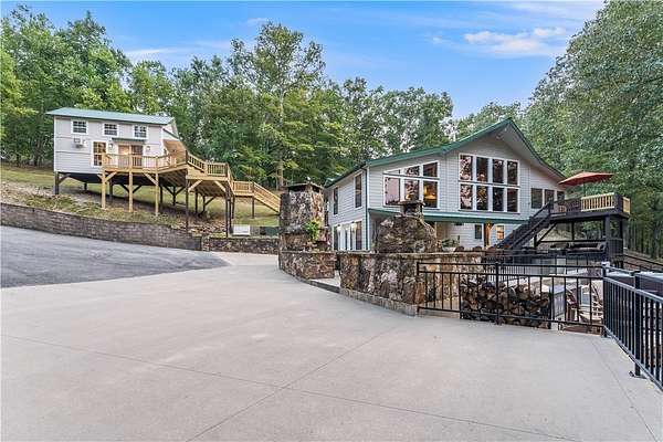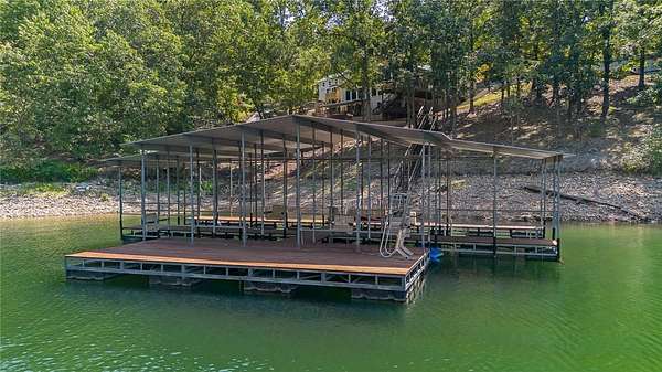 WELOME to the Beaver Lake Chalet were everyday is a vacation! Situated on 1.96 ac that includes a four stall PRIVATE dock, lift and jet ski ramps. Inside you will find three bedrooms all with private baths and an upstairs loft with two built in twin beds. Main living area is all open with soaring ceilings and large windows allowing the natural light and views inside. The dining area includes a custom made glass and cedar table with bench seating and chairs for 10. Step outside the dining area to a relaxing screened porch that leads to another open deck among the trees. A few steps down is an outdoor entertaining paradise that has a large concrete bar (seats 10), commercial stainless grill, huge stone fireplace, separate stone pizza oven, fire pit and relaxing spa!. Back inside you'll find another entertainment room that includes a unique custom bar with microwave/oven combo and commercial Frost top. Up on the knoll is the "tree house" (every child's & adults) fantasy. Finally a 60x39 concrete pad as well.