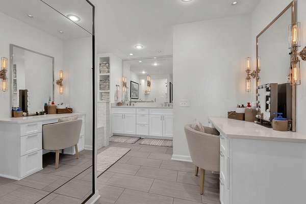 The heart of the home is the chef's kitchen, equipped with stainless steel appliances including a gas stove, double oven, and a range hood. This open kitchen also features premium counters and an over-sized island plus large, walk-in pantry.