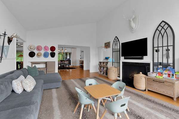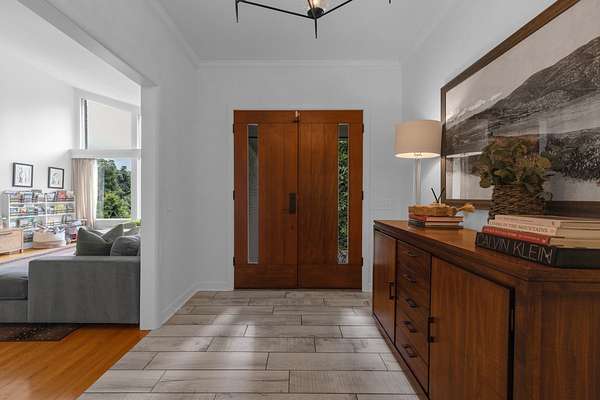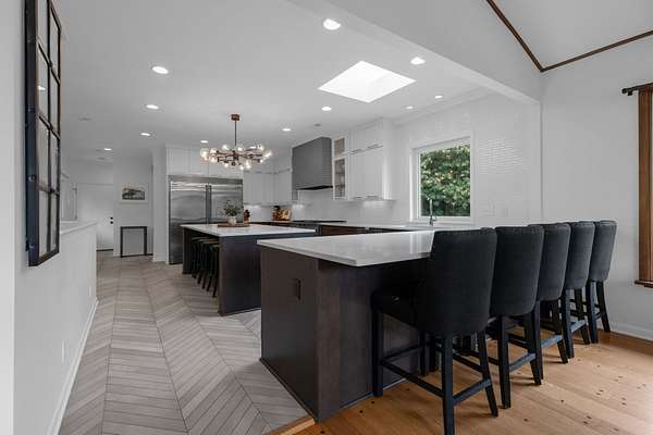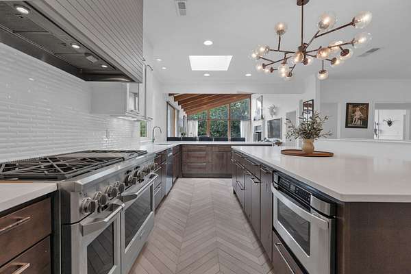 The heart of the home is the chef's kitchen, equipped with stainless steel appliances including a gas stove, double oven, and a range hood. This open kitchen also features premium counters and an over-sized island plus large, walk-in pantry.