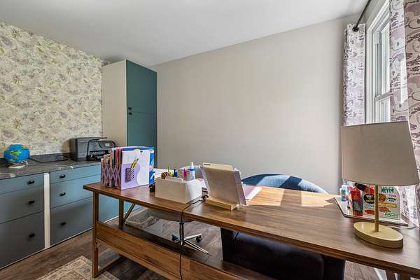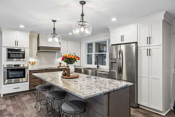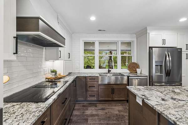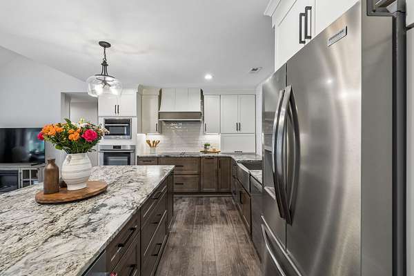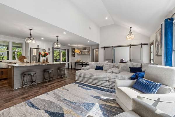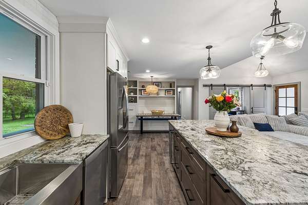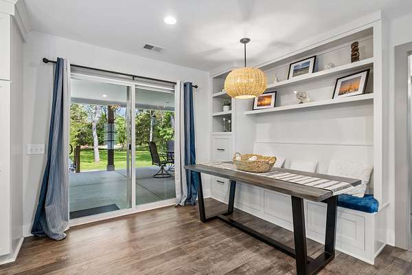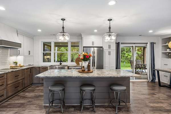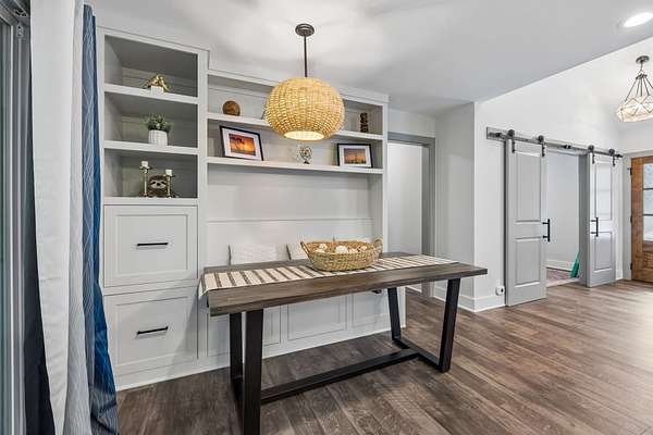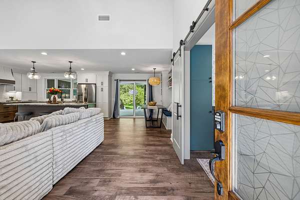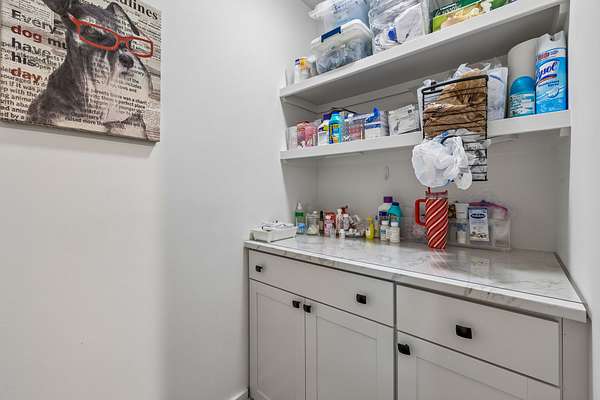 Step inside to find beautiful luxury flooring throughout, fresh designer paint, and an open-concept layout that seamlessly connects the living room, dining area, and gourmet kitchen—ideal for entertaining. The kitchen is a true showpiece, featuring custom cabinetry, sleek granite countertops, a peg system for organization, custom vent hood, deep stainless farmhouse sink, wine fridge, built-in oven and range, built-in pantry, and thoughtfully designed finishes at every turn. The dining area also features custom built-ins for added style and functionality.